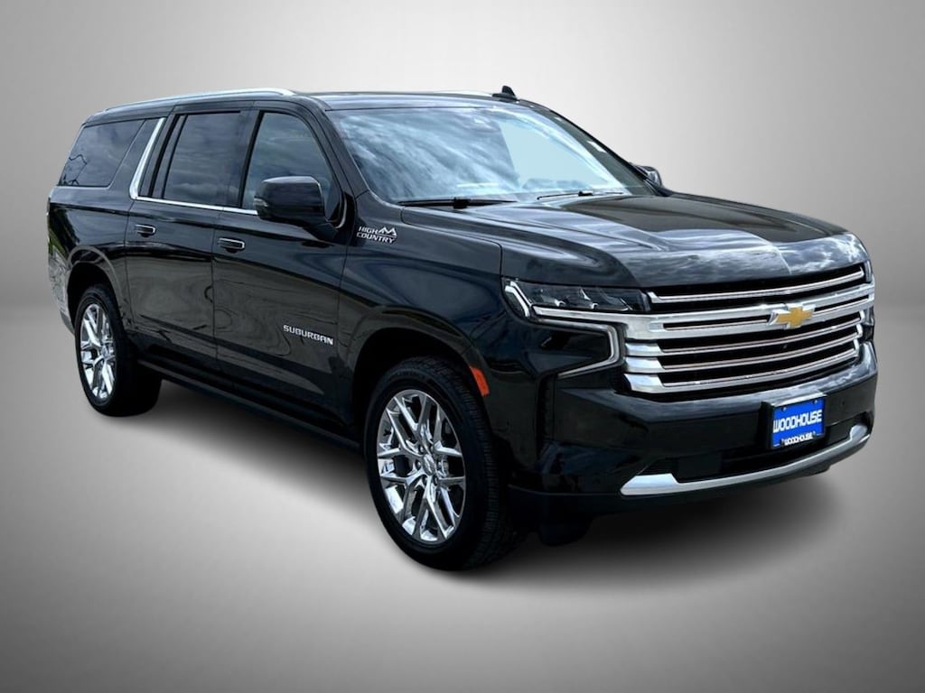 Black 2023 Chevrolet Suburban High Country 4WD 10-Speed Automatic with Overdrive EcoTec3 6.2L V8 15" Diagonal Multi-Color Head-Up Display, 1st & 2nd Row Color-Keyed Carpeted Floor Mats, 2-Speed Active Electronic AutoTrac Transfer Case, 3rd Row 60/40 Power-Folding Split-Bench, Advanced Technology Package, Advanced Trailering Package, Bose 10-Speaker Surround w/CenterPoint, Bright Front & Rear Door Sill Plates, Chrome Door Handles w/Body-Color Strip, Color-Keyed Carpeting Floor Covering, Driver & Front Outboard Passenger Airbags, Dual Exhaust System, Enhanced Automatic Emergency Braking, Enhanced Automatic Parking Assist, Enhanced Driver Information Center, Extra Capacity Cooling System, Floor Console, Hands-Free Rear Power Programmable Liftgate, HD Surround Vision, Heated & Ventilated Driver & Front Passenger Seats, Heated 2nd Row Outboard Seats, Heated Driver & Front Passenger Seats, Heated Steering Wheel, Hill Descent Control, Hitch Guidance w/Hitch View, Infotainment Display, Inside Rearview Auto-Dimming Rear Camera Mirror, Integrated Trailer Brake Controller, Lane Change Alert w/Side Blind Zone Alert, LED Daytime Running Lamps, Max Trailering Package, Memory Settings, Outside Heated Power-Adjustable Mirrors, Power Release 2nd Row Bucket Seats, Power Tilt & Telescopic Steering Column, Preferred Equipment Group 3LZ, Rear Camera Mirror Washer, Rear Cross Traffic Alert, Rear Pedestrian Alert, Remote Start, Reverse Automatic Braking, Safety Alert Seat, SiriusXM Radio w/360L, Smart Trailer Integration Indicator, Super Cruise, Trailer Side Blind Zone Alert, Universal Home Remote, Wireless Charging, Wrapped Steering Wheel, 10 Speakers, 1st, 2nd & 3rd Row All-Weather Floor Liners (LPO), 3.23 Rear Axle Ratio, 3rd row seats: split-bench, 4-Wheel Disc Brakes, ABS brakes, Adaptive Cruise Control, Adaptive suspension, Air Conditioning, Alloy wheels, AM/FM radio: SiriusXM with 360L, Apple CarPlay/Android Auto, Auto High-beam Headlights, Auto-dimming door mirrors, Auto-dimming Rear-View mirror, Auto-leveling suspension, Automatic temperature control, Black Name Plates (LPO), Brake assist, Bumpers: body-color, Compass, Delay-off headlights, Driver door bin, Driver vanity mirror, Dual front impact airbags, Dual front side impact airbags, Dual-Pane Power Panoramic Sunroof, Electronic Stability Control, Emergency communication system: OnStar and Chevrolet connected services capable, Exterior Parking Camera Rear, Four wheel independent suspension, Front & Rear Black Bowtie Emblems (LPO), Front anti-roll bar, Front Bucket Seats, Front Center Armrest, Front dual zone A/C, Front reading lights, Fully automatic headlights, Garage door transmitter, Heads-Up Display, Heated door mirrors, Heated front seats, Heated rear seats, Heated steering wheel, Illuminated entry, License Plate Front Mounting Package, Low tire pressure warning, Magnetic Ride Control Suspension, Memory seat, Navigation System, Occupant sensing airbag, Outside temperature display, Overhead airbag, Overhead console, Panic alarm, Passenger door bin, Passenger vanity mirror, Perforated Leather Seating Surfaces, Power door mirrors, Power driver seat, Power Liftgate, Power passenger seat, Power steering, Power windows, Power-Retractable Assist Steps, Premium audio system: Chevrolet Infotainment 3 Premium, Radio: Chevrolet Infotainment 3 Premium System, Rain sensing wipers, Rear air conditioning, Rear anti-roll bar, Rear reading lights, Rear Seat Media System, Rear window defroster, Rear window wiper, Remote keyless entry, Roof rack: rails only, Security system, Speed control, Speed-sensing steering, Split folding rear seat, Spoiler, Steering wheel memory, Steering wheel mounted audio controls, Super Cruise (DISC), Tachometer, Telescoping steering wheel, Tilt steering wheel, Traction control, Trip computer, Turn signal indicator mirrors, Variably intermittent wipers, Ventilated front seats, Voltmeter, Wheel Locks (Set of 4) (LPO), Wheels