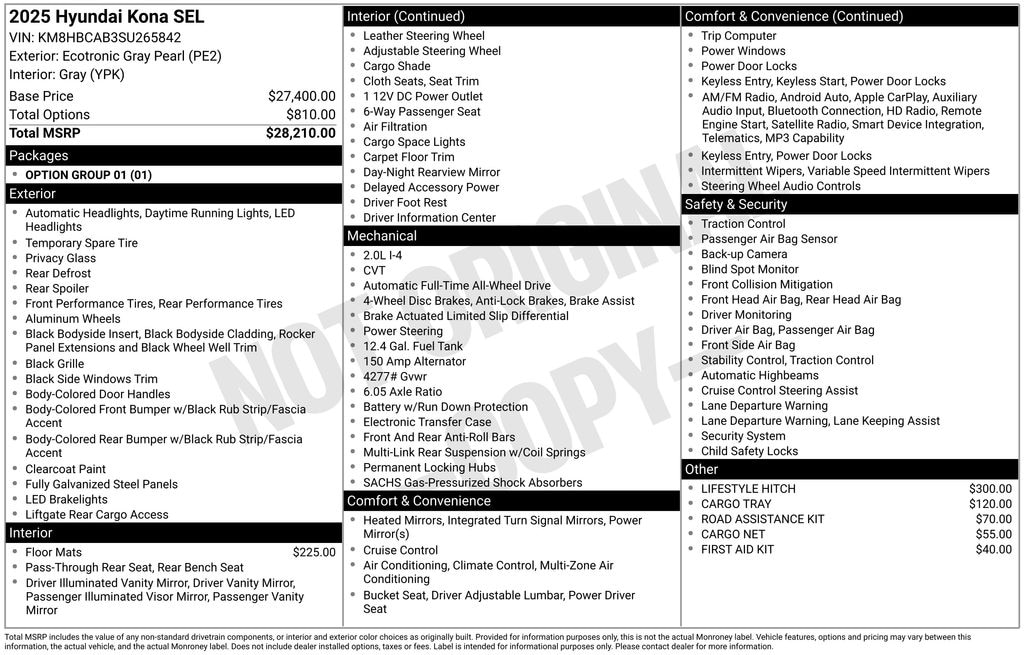 Ecotronic Gray Pearl 2025 Hyundai Kona SEL AWD CVT 2.0L I4 DOHC 16V 4-Wheel Disc Brakes, 6 Speakers, ABS brakes, Air Conditioning, Alloy wheels, AM/FM radio: SiriusXM, Apple CarPlay & Android Auto, Auto High-beam Headlights, Automatic temperature control, Brake assist, Bumpers: body-color, Cargo Net, Cargo Tray, Carpeted Floor Mats, Cloth Seat Trim, Delay-off headlights, Driver door bin, Driver vanity mirror, Dual front impact airbags, Dual front side impact airbags, Electronic Stability Control, Emergency communication system: Bluelink+, Exterior Parking Camera Rear, First Aid Kit, Four wheel independent suspension, Front anti-roll bar, Front Bucket Seats, Front Center Armrest, Front dual zone A/C, Front reading lights, Fully automatic headlights, Heated door mirrors, Illuminated entry, Leather steering wheel, Lifestyle Hitch, Low tire pressure warning, Occupant sensing airbag, Option Group 01, Outside temperature display, Overhead airbag, Panic alarm, Passenger door bin, Passenger vanity mirror, Power door mirrors, Power driver seat, Power steering, Power windows, Radio: AM/FM/HD Radio/SiriusXM Audio System, Rear anti-roll bar, Rear seat center armrest, Rear window defroster, Rear window wiper, Remote keyless entry, Road Assistance Kit, Security system, Speed control, Speed-sensing steering, Split folding rear seat, Spoiler, Steering wheel mounted audio controls, Tachometer, Telescoping steering wheel, Tilt steering wheel, Traction control, Trip computer, Turn signal indicator mirrors, Variably intermittent wipers, Wheels: 18" x 7.0J Glossy Black Alloy.