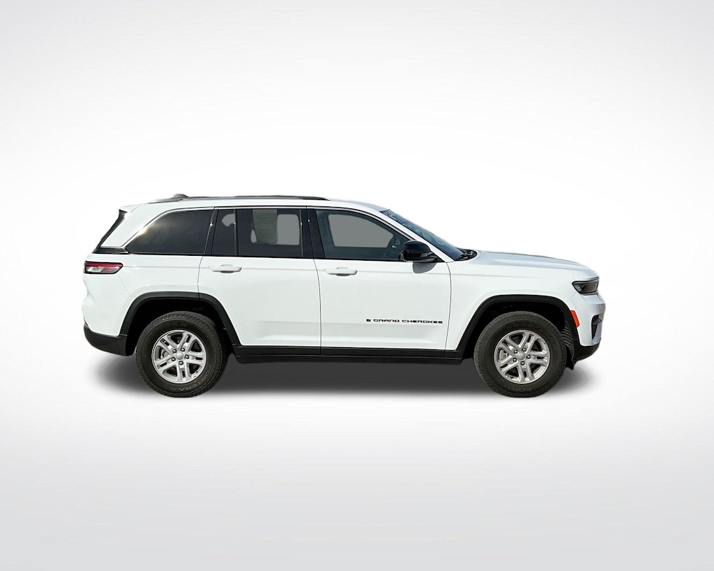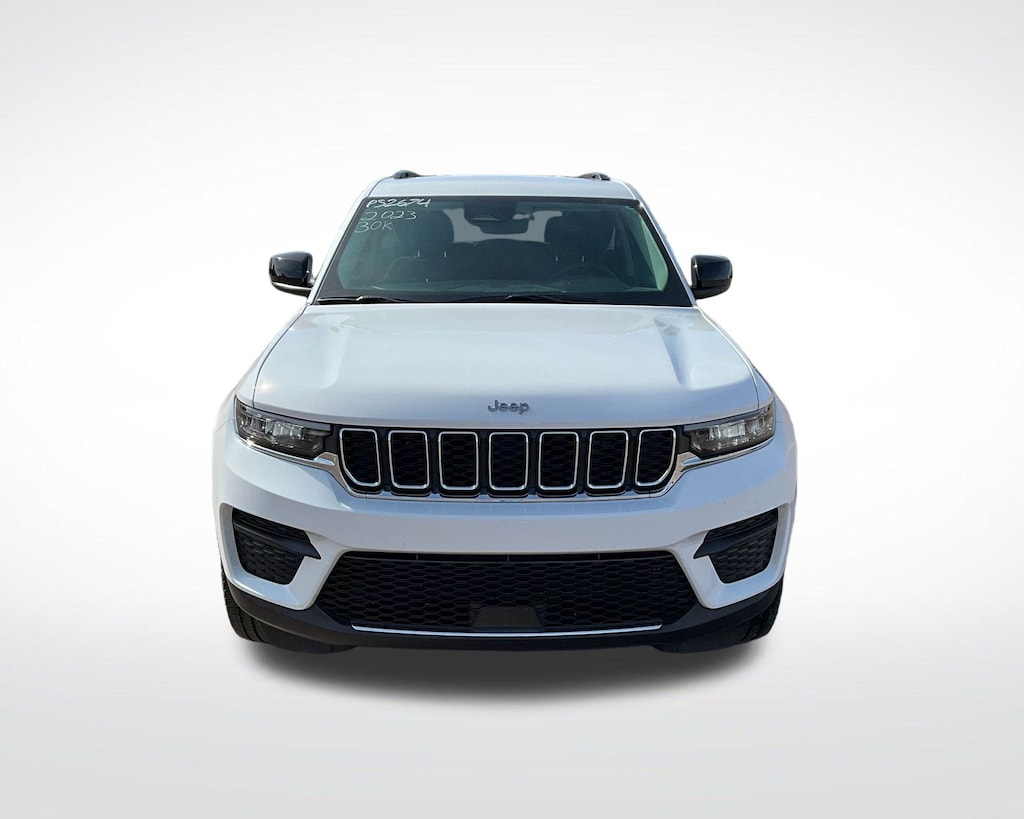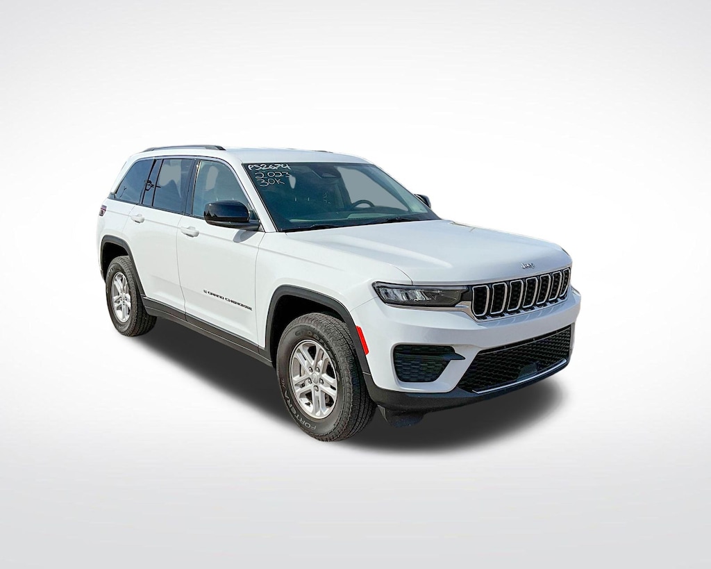 Certified. Bright White Clearcoat 2023 Jeep Grand Cherokee Laredo 4WD 8-Speed Automatic 3.6L V6 24V VVT 3.45 Rear Axle Ratio, 4-Wheel Disc Brakes, 6 Speakers, ABS brakes, Air Conditioning, Alloy wheels, Anti-whiplash front head restraints, Automatic temperature control, Brake assist, Bumpers: body-color, Cloth Seats, Compass, Delay-off headlights, Driver door bin, Driver vanity mirror, Dual front impact airbags, Dual front side impact airbags, Electronic Stability Control, Emergency communication system, Four wheel independent suspension, Front anti-roll bar, Front Bucket Seats, Front Center Armrest w/Storage, Front dual zone A/C, Front License Plate Bracket, Front reading lights, Fully automatic headlights, Heated door mirrors, Illuminated entry, Knee airbag, Low tire pressure warning, Molded In Color Black/Gloss Black Roof Rails, Normal Duty Suspension, Occupant sensing airbag, Outside temperature display, Overhead airbag, Overhead console, Panic alarm, ParkView Rear Back-Up Camera, Passenger door bin, Passenger vanity mirror, Power door mirrors, Power driver seat, Power steering, Power windows, Quick Order Package 23A Laredo, Radio data system, Radio: Uconnect 5 w/8.4" Display, Rear anti-roll bar, Rear reading lights, Rear window defroster, Rear window wiper, Remote keyless entry, Security system, Speed control, Speed-Sensitive Wipers, Split folding rear seat, Spoiler, Steering wheel mounted audio controls, Tachometer, Telescoping steering wheel, Tilt steering wheel, Traction control, Trip computer, Variably intermittent wipers, Voltmeter, Wheels: 17" x 6.5" Fully Painted Aluminum.
