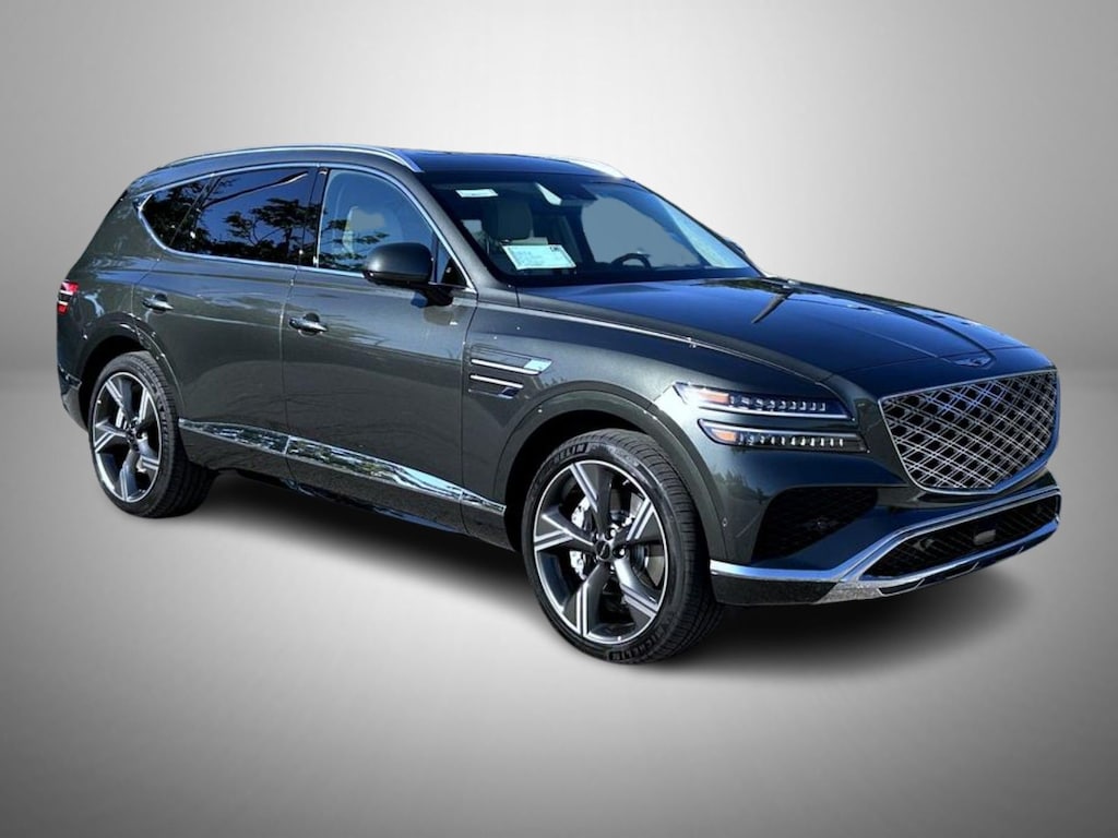 18 Speakers, 3rd row seats: split-bench, 4-Wheel Disc Brakes, ABS brakes, Adaptive suspension, Air Conditioning, Alloy wheels, AM/FM radio: SiriusXM, Anti-whiplash front head restraints, Auto High-beam Headlights, Auto tilt-away steering wheel, Auto-dimming door mirrors, Auto-dimming Rear-View mirror, Automatic temperature control, Brake assist, Bumpers: body-color, Compass, Delay-off headlights, Driver door bin, Driver vanity mirror, Dual front impact airbags, Dual front side impact airbags, Electronic Stability Control, Emergency communication system: Genesis Connected Services, Exterior Parking Camera Rear, Four wheel independent suspension, Front anti-roll bar, Front Bucket Seats, Front Center Armrest, Front dual zone A/C, Front reading lights, Fully automatic headlights, Garage door transmitter: HomeLink, Genuine wood console insert, Genuine wood dashboard insert, Genuine wood door panel insert, Heads-Up Display, Heated & Ventilated Front Bucket Seats, Heated door mirrors, Heated front seats, Heated rear seats, Heated steering wheel, Illuminated entry, Knee airbag, Leather steering wheel, Low tire pressure warning, Memory seat, Nappa Leather Seating Surfaces, Navigation System, Occupant sensing airbag, Option Group 01, Outside temperature display, Overhead airbag, Overhead console, Panic alarm, Passenger door bin, Passenger vanity mirror, Power door mirrors, Power driver seat, Power Liftgate, Power moonroof, Power passenger seat, Power steering, Power windows, Radio data system, Radio: AM/FM/SiriusXM/HD Bang & Olufsen Sound Sys, Rain sensing wipers, Rear air conditioning, Rear anti-roll bar, Rear dual zone A/C, Rear reading lights, Rear seat center armrest, Rear side impact airbag, Rear window defroster, Rear window wiper, Reclining 3rd row seat, Remote keyless entry, Security system, Speed control, Speed-sensing steering, Speed-Sensitive Wipers, Split folding rear seat, Spoiler, Steering wheel memory, Steering wheel mounted audio controls, Tachometer, Telescoping steering wheel, Tilt steering wheel, Traction control, Trip computer, Turn signal indicator mirrors, Variably intermittent wipers, Ventilated front seats, Ventilated rear seats, Wheels: 22" x 9.5J Dark Gray Matte Alloy.