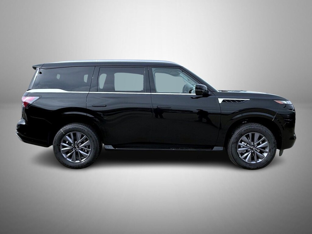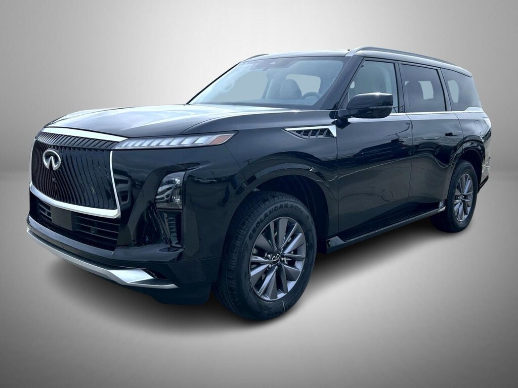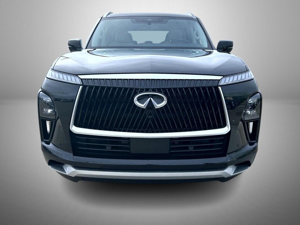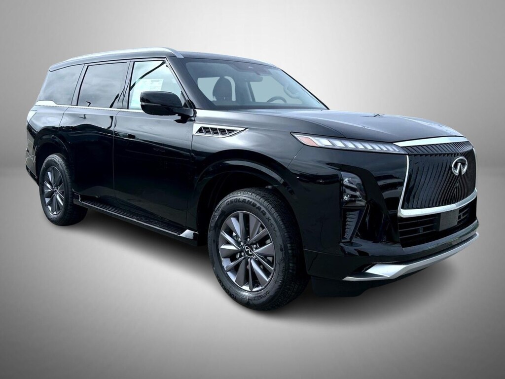 Black Obsidian 2025 INFINITI QX80 4WD 9-Speed Automatic Twin Turbo Premium Unleaded V-6 3.5 L/213 14 Speakers, 20" x 8" Aluminum Alloy Wheels, 3rd row seats: bench, 4-Wheel Disc Brakes, ABS brakes, Air Conditioning, Alloy wheels, AM/FM radio: SiriusXM with 360L, Anti-whiplash front head restraints, Apple CarPlay/Android Auto, Audio memory, Auto High-beam Headlights, Auto tilt-away steering wheel, Auto-dimming door mirrors, Auto-dimming Rear-View mirror, Automatic temperature control, Brake assist, Bumpers: body-color, Compass, Delay-off headlights, Driver door bin, Driver vanity mirror, Dual front impact airbags, Dual front side impact airbags, Electronic Stability Control, Emergency communication system: INFINITI InTouch, Four wheel independent suspension, Front anti-roll bar, Front Bucket Seats, Front Center Armrest, Front dual zone A/C, Front reading lights, Fully automatic headlights, Garage door transmitter: myQ Connected Garage, Heated door mirrors, Heated Front Bucket Seats, Heated front seats, Heated rear seats, Heated steering wheel, HVAC memory, Illuminated entry, Knee airbag, Leather steering wheel, Low tire pressure warning, Memory seat, Navigation system: Google Built-in, Occupant sensing airbag, Outside temperature display, Overhead airbag, Overhead console, Panic alarm, Passenger door bin, Passenger vanity mirror, Power door mirrors, Power driver seat, Power Liftgate, Power moonroof, Power passenger seat, Power steering, Power windows, Radio data system, Radio: Klipsch Premium Audio System w/14 Speakers, Rain sensing wipers, Rear air conditioning, Rear anti-roll bar, Rear reading lights, Rear seat center armrest, Rear window defroster, Rear window wiper, Reclining 3rd row seat, Remote keyless entry, Security system, Speed control, Speed-sensing steering, Split folding rear seat, Spoiler, Steering wheel memory, Steering wheel mounted audio controls, Tachometer, TailorFit-Appointed Seating Surfaces, Telescoping steering wheel, Tilt steering wheel, Traction control, Trip computer, Turn signal indicator mirrors, Variably intermittent wipers.