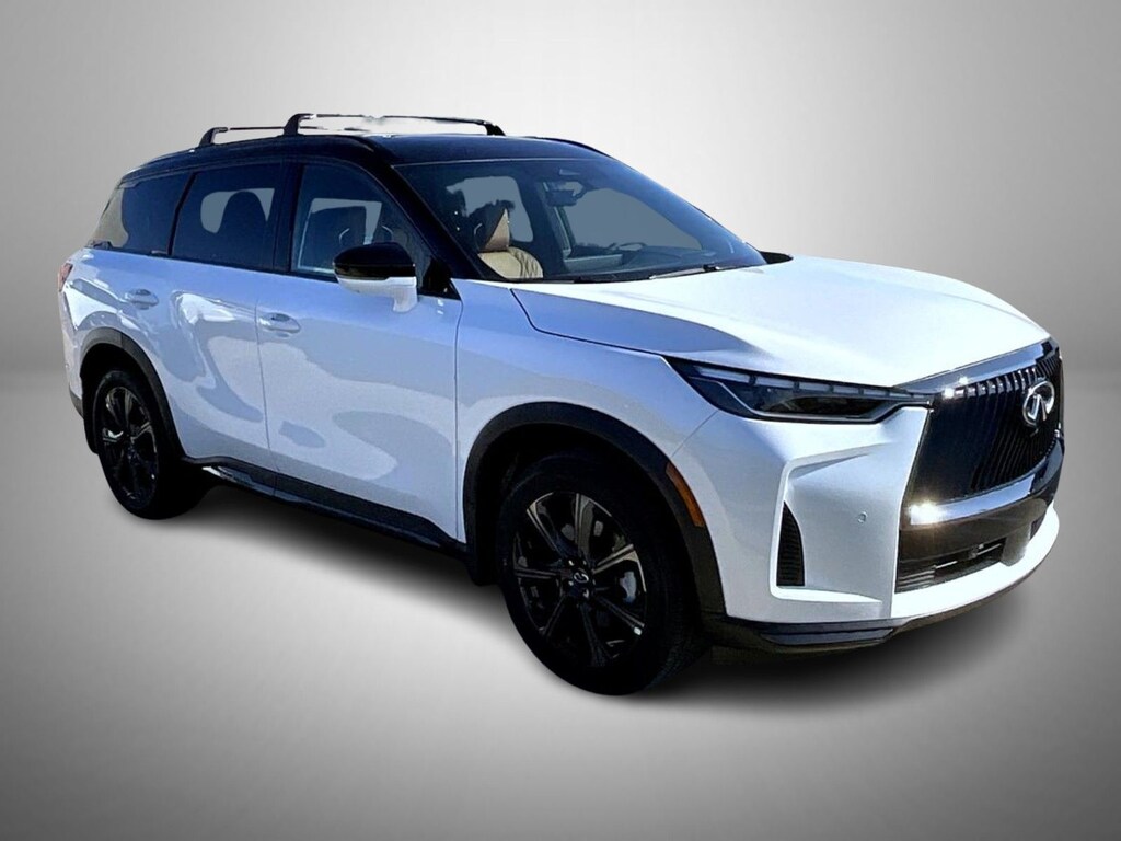 Radiant White/Black Obsidian 2026 INFINITI QX60 AWD 9-Speed Automatic Intercooled Turbo Premium Unleaded I-4 2.0 L/122 2-Tone Super Premium Paint, 20 Speakers, 3rd row seats: bench, 4-Wheel Disc Brakes, ABS brakes, Air Conditioning, Alloy wheels, AM/FM radio: SiriusXM with 360L, Anti-whiplash front head restraints, Apple CarPlay/Android Auto, Auto High-beam Headlights, Auto tilt-away steering wheel, Auto-dimming door mirrors, Auto-dimming Rear-View mirror, Automatic temperature control, Black Rear Bumper Film, Black Roof Rail Crossbars, Bose Performance Series 17-Speaker Sound System, Brake assist, Bumpers: body-color, Cargo Blocks, Cargo Mat, Cargo Net, Climate Controlled Massaging Front Bucket Seats, Dark Cargo Package, Delay-off headlights, Driver door bin, Driver vanity mirror, Dual front impact airbags, Dual front side impact airbags, Electronic Stability Control, Emergency communication system: INFINITI InTouch, Four wheel independent suspension, Front anti-roll bar, Front Bucket Seats, Front Center Armrest, Front dual zone A/C, Front reading lights, Fully automatic headlights, Garage door transmitter: HomeLink, Genuine wood door panel insert, Heads-Up Display, Heated door mirrors, Heated front seats, Heated rear seats, Heated steering wheel, Illuminated entry, Knee airbag, Leather Shift Knob, Leather steering wheel, Low tire pressure warning, Medic Kit, Memory seat, Navigation system: Google Built-in, Occupant sensing airbag, Outside temperature display, Overhead airbag, Overhead console, Panic alarm, Passenger door bin, Passenger vanity mirror, Power door mirrors, Power driver seat, Power Liftgate, Power moonroof: Panoramic, Power passenger seat, Power steering, Power windows, Radio data system, Radio: Klipsch Reference Premiere Audio System, Rain sensing wipers, Rear air conditioning, Rear anti-roll bar, Rear reading lights, Rear side impact airbag, Rear window defroster, Rear window wiper, Reclining 3rd row seat, Remote keyless entry, Security system, Semi Aniline Leather-Appointed Seating Surfaces, Speed control, Speed-sensing steering, Speed-Sensitive Wipers, Splash Guards (B92), Split folding rear seat, Spoiler, Steering wheel memory, Steering wheel mounted audio controls, Tachometer, Telescoping steering wheel, Tilt steering wheel, Traction control, Trip computer, Turn signal indicator mirrors, Variably intermittent wipers, Ventilated front seats, Wheels: 20" x 8J Luxury Machined Aluminum Alloy.