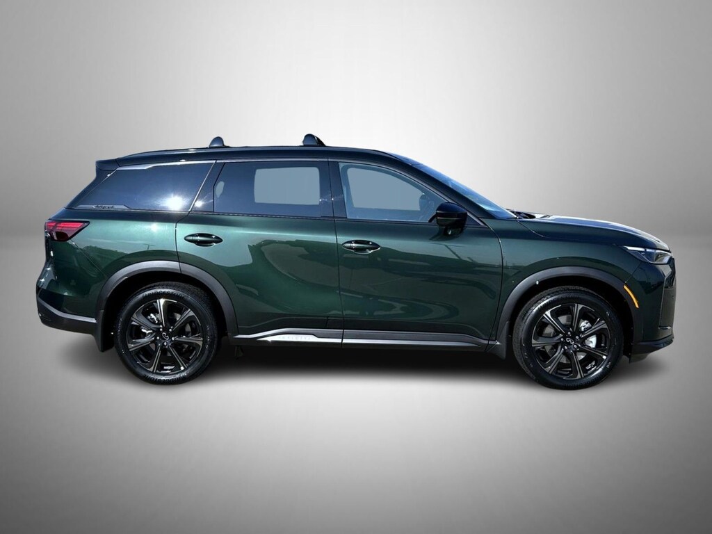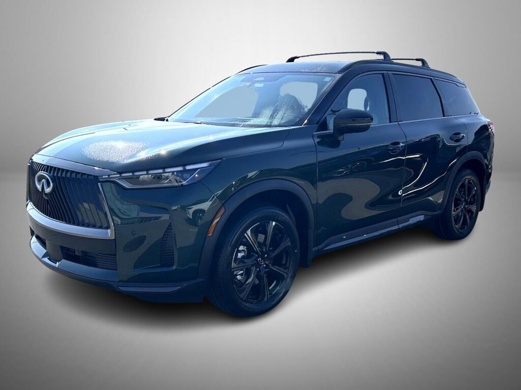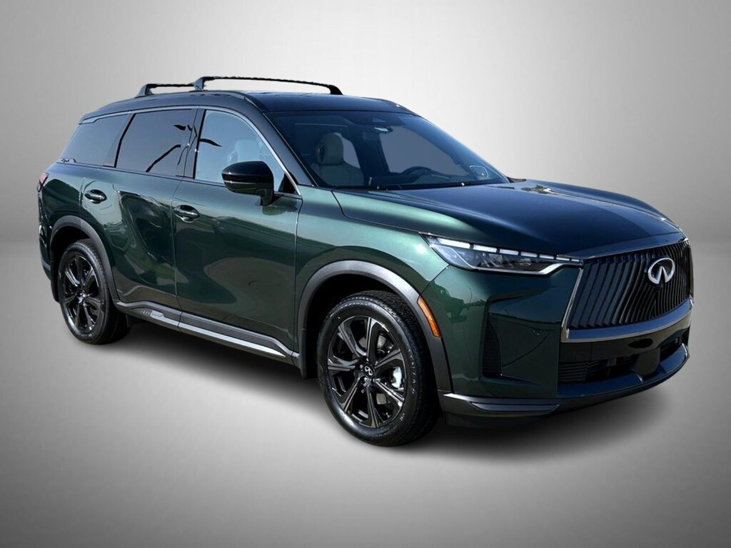 Deep Emerald/Black Obsidian 2026 INFINITI QX60 AWD 9-Speed Automatic Intercooled Turbo Premium Unleaded I-4 2.0 L/122 2-Tone Premium Paint, 20 Speakers, 3rd row seats: bench, 4-Wheel Disc Brakes, ABS brakes, Air Conditioning, Alloy wheels, AM/FM radio: SiriusXM with 360L, Anti-whiplash front head restraints, Apple CarPlay/Android Auto, Auto High-beam Headlights, Auto tilt-away steering wheel, Auto-dimming door mirrors, Auto-dimming Rear-View mirror, Automatic temperature control, Black Rear Bumper Film, Black Roof Rail Crossbars, Bose Performance Series 17-Speaker Sound System, Brake assist, Bumpers: body-color, Cargo Blocks, Cargo Mat, Cargo Net, Climate Controlled Massaging Front Bucket Seats, Dark Cargo Package, Delay-off headlights, Driver door bin, Driver vanity mirror, Dual front impact airbags, Dual front side impact airbags, Electronic Stability Control, Emergency communication system: INFINITI InTouch, Four wheel independent suspension, Front anti-roll bar, Front Bucket Seats, Front Center Armrest, Front dual zone A/C, Front reading lights, Fully automatic headlights, Garage door transmitter: HomeLink, Genuine wood door panel insert, Heads-Up Display, Heated door mirrors, Heated front seats, Heated rear seats, Heated steering wheel, Illuminated entry, Knee airbag, Leather Shift Knob, Leather steering wheel, Low tire pressure warning, Medic Kit, Memory seat, Navigation system: Google Built-in, Occupant sensing airbag, Outside temperature display, Overhead airbag, Overhead console, Panic alarm, Panoramic Illuminated Headliner, Passenger door bin, Passenger vanity mirror, Power door mirrors, Power driver seat, Power Liftgate, Power moonroof: Panoramic, Power passenger seat, Power steering, Power windows, Radio data system, Radio: Klipsch Reference Premiere Audio System, Rain sensing wipers, Rear air conditioning, Rear anti-roll bar, Rear reading lights, Rear side impact airbag, Rear window defroster, Rear window wiper, Reclining 3rd row seat, Remote keyless entry, Security system, Semi Aniline Leather-Appointed Seating Surfaces, Speed control, Speed-sensing steering, Speed-Sensitive Wipers, Splash Guards (B92), Split folding rear seat, Spoiler, Steering wheel memory, Steering wheel mounted audio controls, Tachometer, Telescoping steering wheel, Tilt steering wheel, Traction control, Trip computer, Turn signal indicator mirrors, Variably intermittent wipers, Ventilated front seats, Wheels: 20" x 8J Luxury Machined Aluminum Alloy.