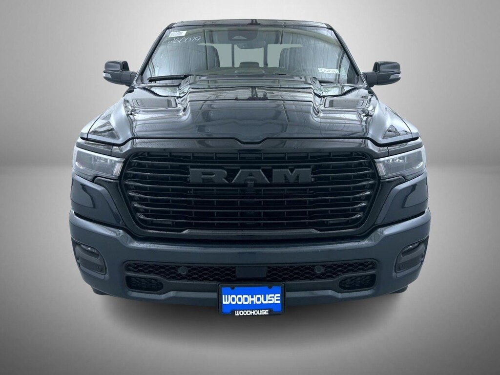 10 Speakers, 14.4" Touchscreen Display, 3.55 Rear Axle Ratio, 33 Gallon Fuel Tank, 4-Wheel Disc Brakes, 4G LTE Wi-Fi Hot Spot, ABS brakes, Accent Color Door Handles, Accent Color Premium Power Mirrors, Accent Color Tailgate Handle, Active Noise Control System, Air Conditioning, Alloy wheels, AM/FM radio: SiriusXM with 360L, Anti-Spin Differential Rear Axle, Apple CarPlay, Apple CarPlay/Android Auto, Audio memory, Auto High-beam Headlights, Auto Power-Folding Mirrors, Auto-dimming door mirrors, Auto-Dimming Exterior Driver Mirror, Auto-dimming Rear-View mirror, Automatic temperature control, Bed Utility Group, Black Exterior Truck Badging, Black Headlamp Bezels, Black Interior Accents, Black Painted Exterior Mirrors Caps, Black Tail Lamp Bezels, Body Color Front Bumper, Body Color Rear Bumper w/Step Pads, Brake assist, Bumpers: chrome, Chrome Exterior Mirrors, Cluster 12" TFT Color Display, Compass, Connected Travel & Traffic Services, Connectivity - US/Canada, Convex Wide-Angle Exterior Mirror Insert, Delay-off headlights, Disassociated Touchscreen Display, Dome Dual LED Reading Lamp, Driver door bin, Driver vanity mirror, Dual Exhaust w/Black Tips, Dual front impact airbags, Dual front side impact airbags, Dual Wireless Charging Pad, Dual-Pane Panoramic Sunroof, Electronic Stability Control, Exterior 115V AC Outlet, Exterior Mirrors Approach Lamps, Exterior Mirrors Courtesy Lamps, Exterior Mirrors w/Heating Element, Exterior Mirrors w/Memory, Exterior Mirrors w/Supplemental Signals, Front anti-roll bar, Front Bucket Seats, Front Center Armrest w/Storage, Front dual zone A/C, Front fog lights, Front License Plate Bracket, Front Passenger Interactive Display, Front reading lights, Front wheel independent suspension, Fully automatic headlights, Garage door transmitter, Global Telematics Box Module (TBM), Google Android Auto, GPS Antenna Input, GPS Navigation, Grille Surround 3 Black Texture 2 Black, harman/kardon 19 Speaker Premium Sound, HD Radio, Heated door mirrors, Heated front seats, Heated rear seats, Heated steering wheel, Illuminated entry, Integrated Center Stack Radio, Integrated Voice Command w/Bluetooth, Laramie Level 2 Equipment Group, Leather steering wheel, Leather Trimmed Bucket Seats, LED Dome/Reading Lamp, Low tire pressure warning, Memory seat, MOPAR 4 Adjustable Cargo Tie-Down Hooks, MOPAR Spray In Bedliner, Navigation System, Night Edition, Occupant sensing airbag, Off-Road Information Pages, Outside temperature display, Overhead airbag, Overhead console, Panic alarm, ParkView Rear Back-Up Camera, Passenger door bin, Passenger vanity mirror, Pirelli Brand Tires, Power Deployable Running Boards, Power door mirrors, Power driver seat, Power passenger seat, Power steering, Power Tailgate, Power windows, Proximity Approach/Departure Lamps, Quick Order Package 21H Laramie, Radio data system, Radio: Uconnect 5 Nav w/12.0" Display, Radio: Uconnect 5 Nav w/14.4" Display, Rain Sensitive Windshield Wipers, RAM Grille Badge - Black, RAM Grille Badge - Chrome, Rear anti-roll bar, Rear reading lights, Rear seat center armrest, Rear step bumper, Remote keyless entry, Secondary Active Grille Shutters, Security system, SiriusXM Radio Service, SiriusXM w/360L, Smartphone As A Key Capable, Speed control, Split folding rear seat, Sport Performance Hood, Steering wheel mounted audio controls, Tachometer, Telescoping steering wheel, Tilt steering wheel, Traction control, Trailer Brake Control, Trip computer, Turn signal indicator mirrors, USB Host Flip, Variably intermittent wipers, Ventilated front seats, Voltmeter, Wheels: 20" x 9" Premium Paint/Polish, Wheels: 22" x 9" Forged Aluminum.