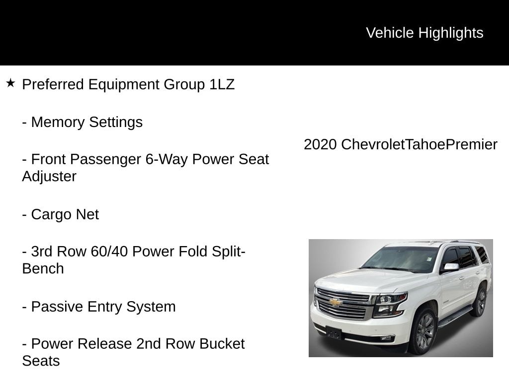 Iridescent Pearl Tricoat 2020 Chevrolet Tahoe Premier 4WD 6-Speed Automatic Electronic with Overdrive EcoTec3 5.3L V8 1st & 2nd Row Color-Keyed Carpeted Floor Mats, 3.42 Rear Axle Ratio, 3rd Row 60/40 Power Fold Split-Bench, 4-Wheel Antilock Disc Brakes w/Brake Assist, 5 12-Volt Auxiliary Power Outlets, Auto-Dimming Inside Rear-View Mirror, Automatic Emergency Braking, Black Assist Steps w/Chrome Accent Strip, Bose Centerpoint Premium 10-Speaker Surround Sound, Cargo Net, Color-Keyed Carpeting Floor Covering, Driver Inboard & Front Passenger Airbags, Electronic Cruise Control w/Set & Resume Speed, Enhanced Driver Alert Package (Y86), Floor Console, Fog Lamps, Forward Collision Alert, Front & Rear Park Assist, Front Passenger 6-Way Power Seat Adjuster, Hands Free Power Liftgate, Heated & Ventilated Driver & Front Passenger Seats, Heated 2nd Row Outboard Seats, Heated Leather Wrapped Steering Wheel, Integrated Trailer Brake Controller, IntelliBeam Headlamps, Lane Change Alert w/Side Blind Zone Alert, Lane Keep Assist w/Lane Departure Warning, Magnetic Ride Control Suspension Package, Max Trailering Package, Memory Settings, Passive Entry System, Power Release 2nd Row Bucket Seats, Power Sunroof, Power Tilt & Telescopic Steering Column, Power-Adjustable Accelerator & Brake Pedals, Power-Folding Heated Outside Mirrors, Preferred Equipment Group 1LZ, Push Button Keyless Start, Rear Cross Traffic Alert, Rear Seat Blu-Ray/DVD Entertainment System, Remote Keyless Entry, Remote Vehicle Start, Roof-Mounted Luggage Rack Side Rails, SiriusXM NavTraffic, SiriusXM Radio, Sun, Entertainment & Destinations Package, Universal Home Remote, Wireless Charging, 10 Speakers, 3rd row seats: split-bench, 4-Wheel Disc Brakes, ABS brakes, Adaptive suspension, Adjustable pedals, Air Conditioning, All-Weather Floor Mats, All-Weather Rear Cargo Mat (LPO), Alloy wheels, AM/FM radio: SiriusXM, Apple CarPlay/Android Auto, Auto High-beam Headlights, Auto-dimming door mirrors, Auto-dimming Rear-View mirror, Auto-leveling suspension, Automatic temperature control, Bluetooth for Phone, Bodyside moldings, Brake assist, Bumpers: body-color, CD player, Compass, Delay-off headlights, Driver door bin, Driver vanity mirror, Dual front impact airbags, Dual front side impact airbags, Electronic Stability Control, Emergency communication system: OnStar and Chevrolet connected services capable, Enhanced Driver Information Center, Exterior Parking Camera Rear, Front anti-roll bar, Front Bucket Seats, Front Center Armrest, Front dual zone A/C, Front fog lights, Front Heated Reclining Bucket Seats, Front reading lights, Front wheel independent suspension, Fully automatic headlights, Garage door transmitter, HD Radio, Head-Up Display, Heated door mirrors, Heated front seats, Heated rear seats, Heated steering wheel, High-Intensity Discharge Headlights, Illuminated entry, Interior Protection Package (LPO), Leather steering wheel, License Plate Front Mounting Package, Low tire pressure warning, Memory seat, Molded Splash Guards, Navigation System, Occupant sensing airbag, Outside temperature display, Overhead airbag, Overhead console, Panic alarm, Passenger door bin, Passenger vanity mirror, Pedal memory, Perforated Leather-Appointed Seat Trim, Polished Exhaust Tip, Power door mirrors, Power driver seat, Power Liftgate, Power passenger seat, Power steering, Power windows, Premium audio system: Chevrolet MyLink, Radio: Chevrolet Infotainment AM/FM Stereo w/Nav, Rain sensing wipers, Rear air conditioning, Rear anti-roll bar, Rear reading lights, Rear window defroster, Rear window wiper, Remote keyless entry, Security system, Set of 4 Wheel Locks (LPO), Single-Slot CD/MP3 Player, Speed control, Speed-sensing steering, Split folding rear seat, Spoiler, Steering wheel memory, Steering wheel mounted audio controls, Tachometer, Telescoping steering wheel, Tilt steering wheel, Traction control, Trip computer, Turn signal indicator mirrors, Variably intermittent wipers, Ventilated front