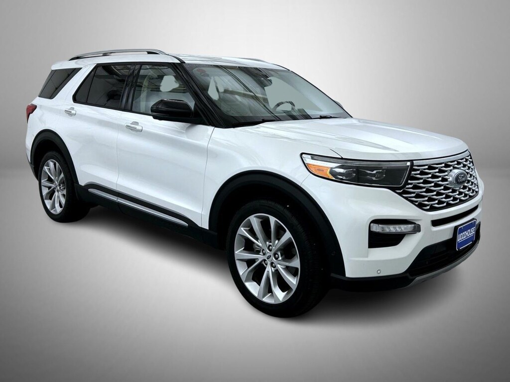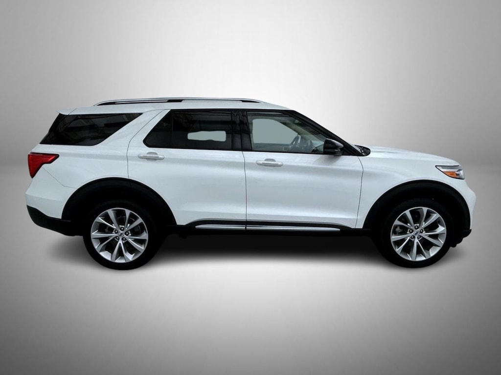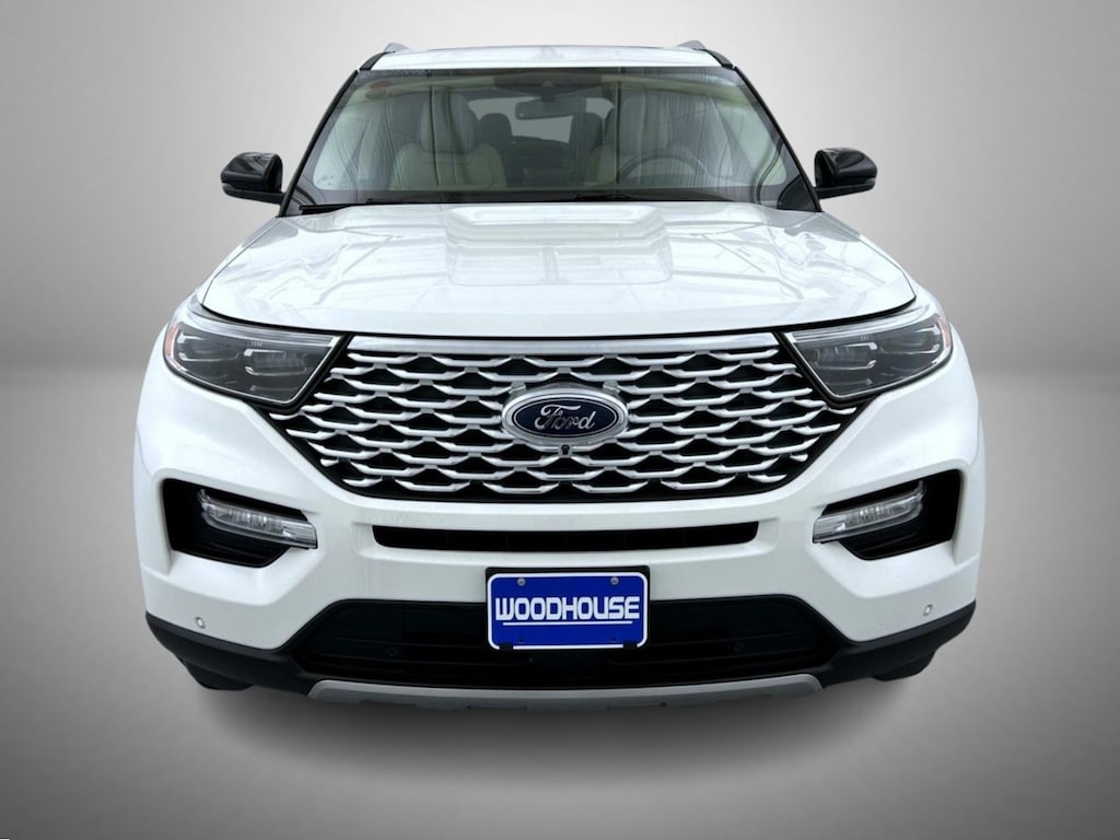 Star White Metallic Tri-Coat 2021 Ford Explorer Platinum 4WD 10-Speed Automatic 3.0L EcoBoost V6 10.1" LCD Capacitive Portrait Touchscreen, 12 Speakers, 2 Additional Speakers, 3.31 Non-Limited-Slip Axle Ratio, 3rd row seats: bench, 4-Wheel Disc Brakes, ABS brakes, Air Conditioning, Alloy wheels, AM/FM radio: SiriusXM, Auto High-beam Headlights, Auto-dimming door mirrors, Auto-dimming Rear-View mirror, Automatic temperature control, Brake assist, Bumpers: body-color, Compass, Delay-off headlights, Driver door bin, Driver vanity mirror, Dual front impact airbags, Dual front side impact airbags, Electronic Stability Control, Emergency communication system: SYNC 3 911 Assist, Equipment Group 601A, Exterior Parking Camera Rear, FordPass Connect, Four wheel independent suspension, Front anti-roll bar, Front Bucket Seats, Front Center Armrest, Front dual zone A/C, Front fog lights, Front reading lights, Fully automatic headlights, Garage door transmitter: HomeLink, Genuine wood dashboard insert, Heated door mirrors, Heated front seats, Heated rear seats, Heated steering wheel, Illuminated entry, Knee airbag, Leather Htd/Ventilated Sport Captain's Chairs, Leather steering wheel, Low tire pressure warning, Memory seat, Navigation System, Occupant sensing airbag, Outside temperature display, Overhead airbag, Overhead console, Panic alarm, Passenger door bin, Passenger vanity mirror, Power door mirrors, Power driver seat, Power Liftgate, Power passenger seat, Power steering, Power windows, Premium Technology Package, Radio data system, Radio: B&O Sound System by Bang & Olufsen, Rain sensing wipers, Rear air conditioning, Rear anti-roll bar, Rear reading lights, Rear window defroster, Rear window wiper, Remote keyless entry, Roof rack: rails only, Security system, SelectShift Capability w/Paddle Shifters, Speed control, Speed-sensing steering, Speed-Sensitive Wipers, Split folding rear seat, Spoiler, Steering wheel memory, Steering wheel mounted audio controls, SYNC 3 Communications & Entertainment System, SYNC 3/Apple CarPlay/Android Auto, Tachometer, Telescoping steering wheel, Tilt steering wheel, Traction control, Trip computer, Turn signal indicator mirrors, Twin Panel Moonroof, Variably intermittent wipers, Ventilated front seats, Voice-Activated Touchscreen Navigation System, Wheels: 21" Bright Machined-Face Aluminum.
