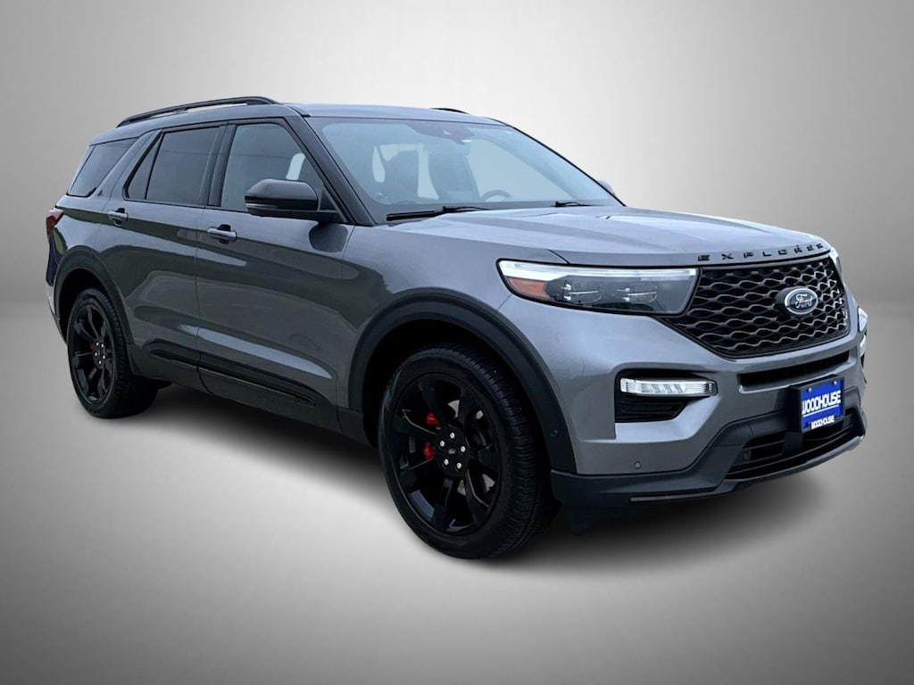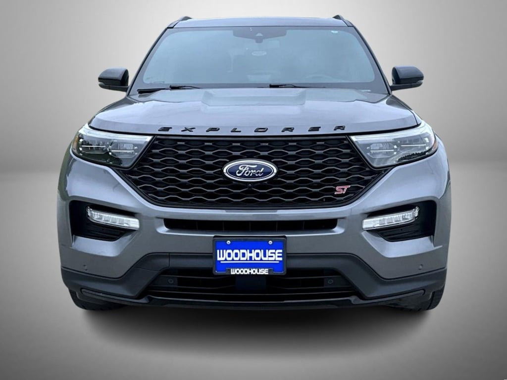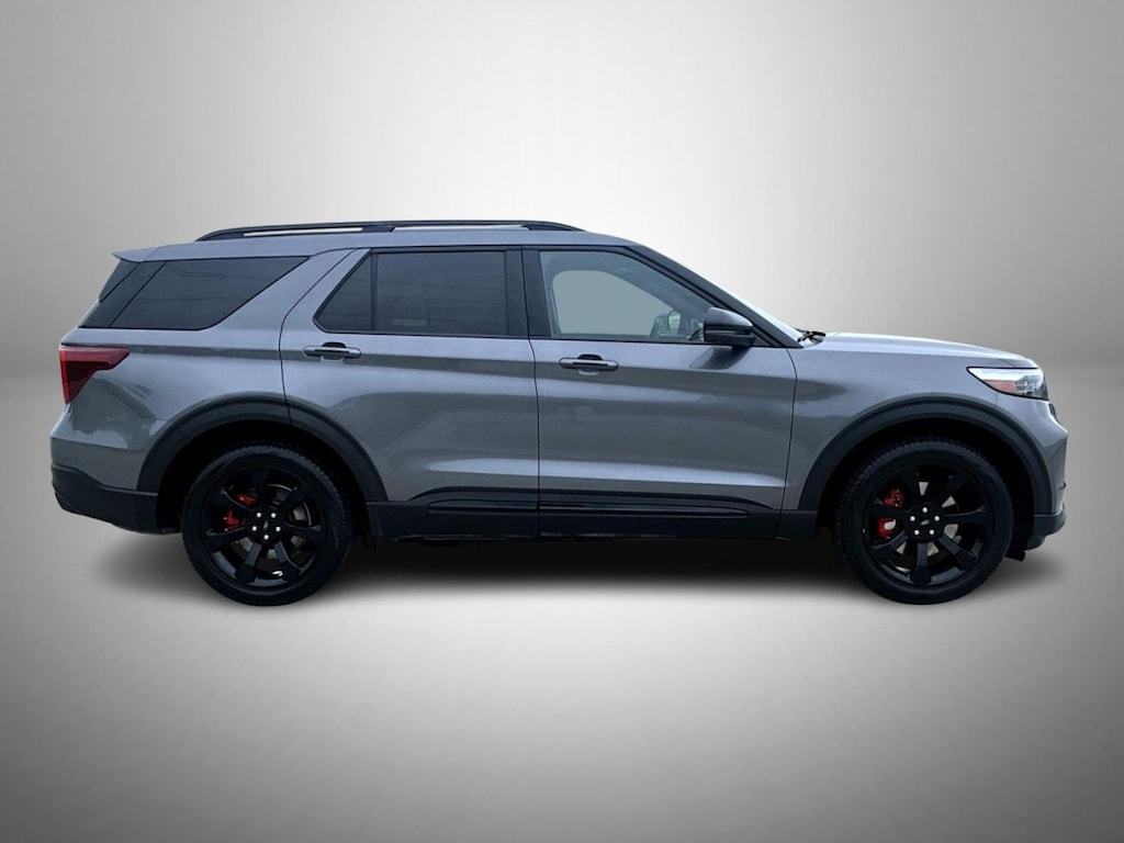 Gray 2021 Ford Explorer ST 4WD 10-Speed Automatic 3.0L EcoBoost V6 4WD, 10.1" LCD Capacitive Portrait Touchscreen, 110V/150W AC Power Outlet, 2 Additional Speakers, 20" Machined Aluminum w/Painted Pockets Wheels, 3.58 Non-Limited-Slip Rear Axle Ratio, 360-Degree Camera w/Split View, 3rd row seats: bench, 4-Wheel Disc Brakes, 6 Speakers, ABS brakes, Active Park Assist 2.0, Air Conditioning, Alloy wheels, AM/FM radio: SiriusXM, AM/FM Stereo, Auto High-beam Headlights, Auto-Dimming Rearview Mirror (Interior), Automatic temperature control, Black Roof-Rack Side Rails, Brake assist, Bumpers: body-color, Compass, Delay-off headlights, Driver door bin, Driver vanity mirror, Dual front impact airbags, Dual front side impact airbags, Electronic Stability Control, Emergency communication system: SYNC 3 911 Assist, Equipment Group 401A, Evasive Steering Assist, Exterior Parking Camera Rear, Ford Co-Pilot360 Assist+, FordPass Connect, Forward Sensing System, Four wheel independent suspension, Front anti-roll bar, Front Bucket Seats, Front Center Armrest, Front dual zone A/C, Front fog lights, Front Rain-Sensing Wipers, Front reading lights, Fully automatic headlights, Hands-Free Foot-Activated Liftgate, Heated door mirrors, Heated front seats, Heated steering wheel, Illuminated entry, Intelligent Adaptive Cruise Control, Knee airbag, Leather Htd/Ventilated Sport Captain's Chairs, Leather steering wheel, Low tire pressure warning, Memory Driver's Seat, Occupant sensing airbag, Outside temperature display, Overhead airbag, Overhead console, Panic alarm, Passenger door bin, Passenger vanity mirror, Performance Front & Rear Brakes, Power door mirrors, Power driver seat, Power Liftgate, Power passenger seat, Power steering, Power Tilt/Telescoping Steering Column, Power windows, Premium Technology Package, Radio: B&O Sound System by Bang & Olufsen, Rear air conditioning, Rear anti-roll bar, Rear reading lights, Rear window defroster, Rear window wiper, Remote keyless entry, Reverse Brake Assist, Second Row Heated Seats, Security system, SelectShift Capability w/Paddle Shifters, Sideview Mirrors w/Gloss Black Caps, Speed control, Speed Sign Recognition, Speed-sensing steering, Speed-Sensitive Wipers, Split folding rear seat, Spoiler, Sport steering wheel, ST High Package, ST Street Pack, Steering wheel mounted audio controls, SYNC 3 Communications & Entertainment System, SYNC 3/Apple CarPlay/Android Auto, Tachometer, Telescoping steering wheel, Third Row PowerFold (Folds Flat), Tilt steering wheel, Traction control, Trip computer, Twin Panel Moonroof, Universal Garage Door Opener (UGDO), Variably intermittent wipers, Voice-Activated Touchscreen Navigation System, Wheels: 21" Aluminum, Wireless Charging Pad, 4WD.