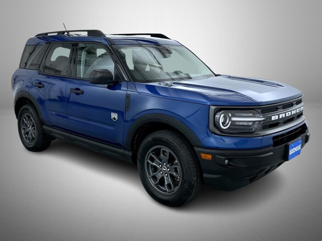 Atlas Blue Metallic 2023 Ford Bronco Sport Big Bend 4WD 8-Speed Automatic 1.5L EcoBoost 3.80 Axle Ratio, 4-Wheel Disc Brakes, 4G LTE Wi-Fi Hotspot Credit, 6 Speakers, ABS brakes, Air Conditioning, Alloy wheels, AM/FM radio: SiriusXM, AM/FM Stereo, Auto High-beam Headlights, Automatic temperature control, Brake assist, Compass, Convenience Package, Delay-off headlights, Driver door bin, Driver vanity mirror, Dual front impact airbags, Dual front side impact airbags, Electronic Stability Control, Emergency communication system: SYNC 3 911 Assist, Equipment Group 200A, Four wheel independent suspension, Front anti-roll bar, Front Bucket Seats, Front Center Armrest, Front Driver & Passenger Seatback Zipper Pockets, Front License Plate Bracket, Front reading lights, Fully automatic headlights, Heated door mirrors, Heated Front Bucket Seats, Illuminated entry, Intelligent Access (Lock/Unlock), Knee airbag, Leather-Wrapped Steering Wheel, LED Fog Lamps, Low tire pressure warning, Occupant sensing airbag, Outside temperature display, Overhead airbag, Overhead console, Panic alarm, Passenger door bin, Passenger vanity mirror, Power door mirrors, Power steering, Power windows, Radio data system, Rear anti-roll bar, Rear Parking Sensors, Rear reading lights, Rear seat center armrest, Rear window defroster, Rear window wiper, Remote keyless entry, Security system, SiriusXM, Speed control, Speed-sensing steering, Speed-Sensitive Wipers, Split folding rear seat, Steering wheel mounted audio controls, SYNC 3 Communications & Entertainment System, SYNC 3/Apple CarPlay/Android Auto, Tachometer, Telescoping steering wheel, Tilt steering wheel, Traction control, Trip computer, Unique Cloth Front Bucket Seats, Universal Garage Door Opener (UGDO), Variably intermittent wipers, Wheels: 17" Carbonized Gray-Painted Aluminum, Wireless Charging Pad.