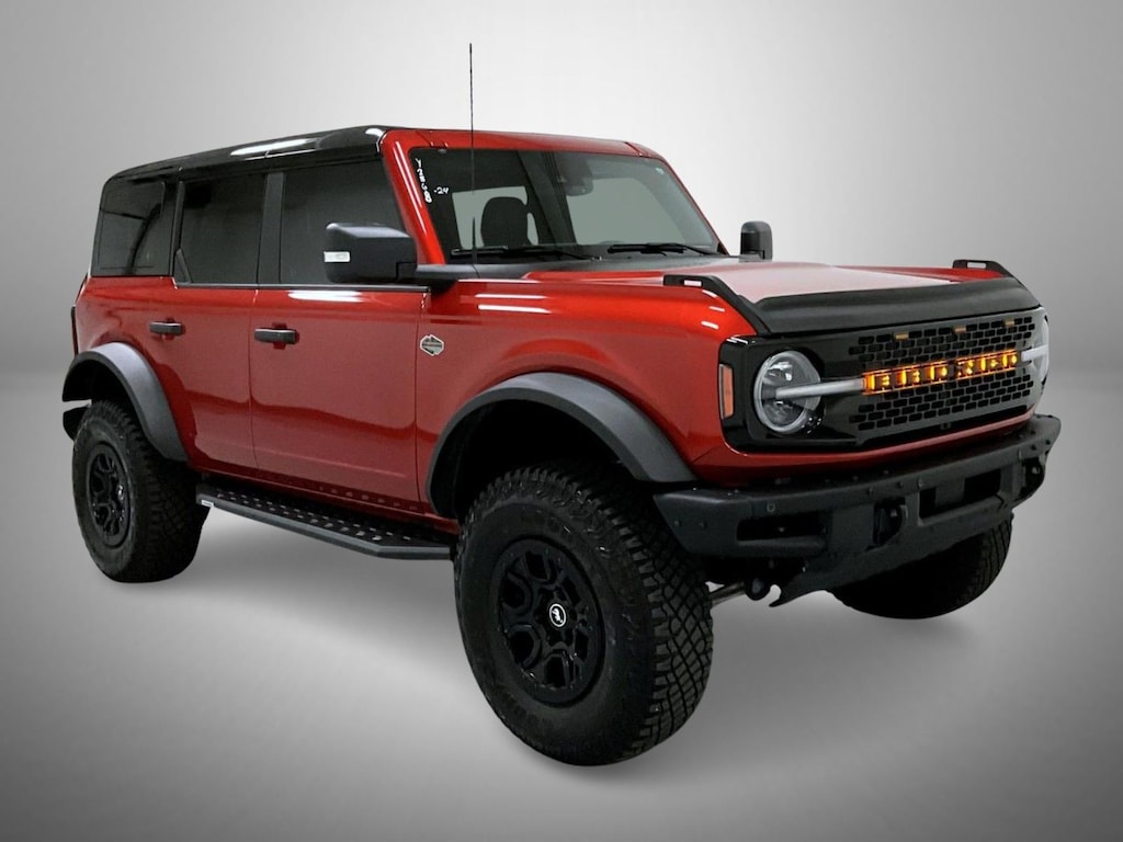 Hot Pepper Red Metallic Tinted Clearcoat 2024 Ford Bronco Wildtrak 4WD 10-Speed Automatic 2.7L EcoBoost V6 10 Speakers w/Subwoofer, 360-Degree Camera, 4-Wheel Disc Brakes, 4.7 Axle Ratio, 7 Speakers, ABS brakes, Adaptive Cruise Control, Additional Sound Deadening, Air Conditioning, Alloy wheels, AM/FM radio: SiriusXM with 360L, AM/FM Stereo, Auto High-beam Headlights, Auto-dimming Rear-View mirror, Automatic temperature control, Brake assist, Compass, Connected Navigation, Delay-off headlights, Driver door bin, Driver vanity mirror, Dual front impact airbags, Dual front side impact airbags, Electronic Stability Control, Emergency communication system: 911 Assist, Equipment Group 354A High/Lux Package, Evasive Steering Assist, Exterior Parking Camera Rear, Front anti-roll bar, Front Bucket Seats, Front Center Armrest, Front dual zone A/C, Front fog lights, Front License Plate Bracket, Front Parking Sensors, Front reading lights, Front Row Top Panels Storage Bag, Front wheel independent suspension, Fully automatic headlights, Hard Top Sound Deadening Headliner, Heated door mirrors, Heated front seats, Heated Leather-Trimmed/Vinyl Bucket Seats, Heated Steering Wheel, Illuminated entry, Information on Demand Panel, Integrated roll-over protection, Leather Shift Knob, Low tire pressure warning, Navigation system: Connected Navigation, Occupant sensing airbag, Outside temperature display, Overhead airbag, Overhead console, Panic alarm, Passenger door bin, Passenger vanity mirror, Power door mirrors, Power steering, Power windows, Radio data system, Radio: B&O Sound System by Bang & Olufsen, Rear-Window Defroster & Washer, Remote keyless entry, Security system, Shadow Black Painted Hard Top, Sideview Mirrors, SiriusXM Radio w/360L, Speed control, Split folding rear seat, Steering wheel mounted audio controls, SYNC 4, Tachometer, Telescoping steering wheel, Tilt steering wheel, Traction control, Trip computer, Universal Garage Door Opener, Variably intermittent wipers, Voltmeter, Wheels: 17" Black High Gloss-Painted Aluminum, Wireless Charging Pad.