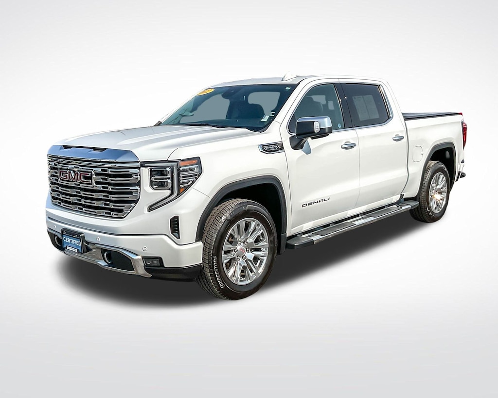 Summit White 2022 GMC Sierra 1500 Denali 4WD 10-Speed Automatic EcoTec3 5.3L V8 10-Speed Automatic, 4WD, Jet Black Leather, 10-Way Power Driver Seat Adjuster w/Lumbar, 10-Way Power Passenger Seat Adjuster w/Lumbar, 120-Volt Bed Mounted Power Outlet, 120-Volt Instrument Panel Power Outlet, 170 Amp Alternator, 2 Charge/Data USB Ports Inside Center Console, 2 Type-C Charge-Only Rear USB Ports, 2 USB Ports, 3.23 Rear Axle Ratio, 4-Wheel Disc Brakes, 7 Speakers, ABS brakes, Adaptive suspension, Air Conditioning, Alloy wheels, AM/FM radio: SiriusXM with 360L, Apple CarPlay/Android Auto, Auto High-beam Headlights, Auto-dimming door mirrors, Auto-dimming Rear-View mirror, Auto-Locking Rear Differential, Automatic Emergency Braking, Automatic temperature control, Auxiliary External Transmission Oil Cooler, Bed View Camera, Brake assist, Buckle to Drive, Bumpers: body-color, Chrome Header w/Signature Denali Chrome Grille, Chrome Recovery Hooks, Chrome Wheel To Wheel Assist Steps, Color-Keyed Carpeting Floor Covering, Compass, Deep-Tinted Glass, Delay-off headlights, Denali Premium Suspension w/Adaptive Ride Control, Driver door bin, Driver Memory, Driver vanity mirror, Dual front impact airbags, Dual front side impact airbags, Electric Rear-Window Defogger, Electrical Steering Column Lock, Electronic Stability Control, Emergency communication system: OnStar and GMC Connected Services capable, Floor-Mounted Center Console, Following Distance Indicator, Forge Perforated Leather Seat Trim, Forward Collision Alert, Front anti-roll bar, Front Bucket Seats, Front Center Armrest, Front dual zone A/C, Front fog lights, Front Pedestrian Braking, Front Rainsensing Wipers, Front reading lights, Front wheel independent suspension, Fully automatic headlights, Garage door transmitter, Genuine wood console insert, Genuine wood dashboard insert, Genuine wood door panel insert, GMC Connected Access Capable, HD Surround Vision, Heated 2nd Row Outboard Seats, Heated door mirrors, Heated Driver & Front Outboard Passenger Seating, Heated front seats, Heated rear seats, Heated Steering Wheel, Heated steering wheel, Heavy-Duty Air Filter, Hill Descent Control, Hitch Guidance, Hitch Guidance w/Hitch View, Illuminated entry, In-Vehicle Trailering App, Integrated Trailer Brake Controller, IntelliBeam Automatic High Beam On/Off, Keyless Open & Start, Lane Keep Assist w/Lane Departure Warning, LED Cargo Area Lighting, Low tire pressure warning, Memory seat, Navigation System, Not Equipped w/Dynamic Fuel Management, Not Equipped w/Heated Steering Wheel (DISC), Occupant sensing airbag, OnStar & GMC Connected Services Capable, Outside temperature display, Overhead airbag, Overhead console, Panic alarm, Passenger door bin, Passenger vanity mirror, Perimeter Lighting, Power Door Locks, Power door mirrors, Power driver seat, Power Front Passenger Windows w/Express Up/Down, Power Front Windows w/Driver Express Up/Down, Power passenger seat, Power Rake & Telescoping Steering Column, Power Rear Windows w/Express Down, Power Sliding Rear Window w/Rear Defogger, Power steering, Power Sunroof, Power windows, Preferred Equipment Group 5SA, Premium audio system: GMC Infotainment System, Premium Bose 7-Speaker Sound System, Push Button Start, Radio data system, Radio: Premium GMC Infotainment Audio System, Rain sensing wipers, Rear Cross Traffic Braking, Rear Pedestrian Detection, Rear reading lights, Rear seat center armrest, Rear step bumper, Rear Wheelhouse Liners, Rear window defroster, Remote keyless entry, Remote Vehicle Starter System, Safety Alert Seat, Security system, SiriusXM w/360L, Speed control, Speed-sensing steering, Split folding rear seat, Spray-On Pickup Bed Liner w/Denali Logo, Steering Wheel Audio Controls, Steering wheel mounted audio controls, Tachometer, Telescoping steering wheel, Theft Deterrent System (Unauthorized Entry), Tilt steering wheel, Traction control, Trailer Camera Provisions, Trailer Side Blind Zone Alert, Trailering Package, Trip computer,
