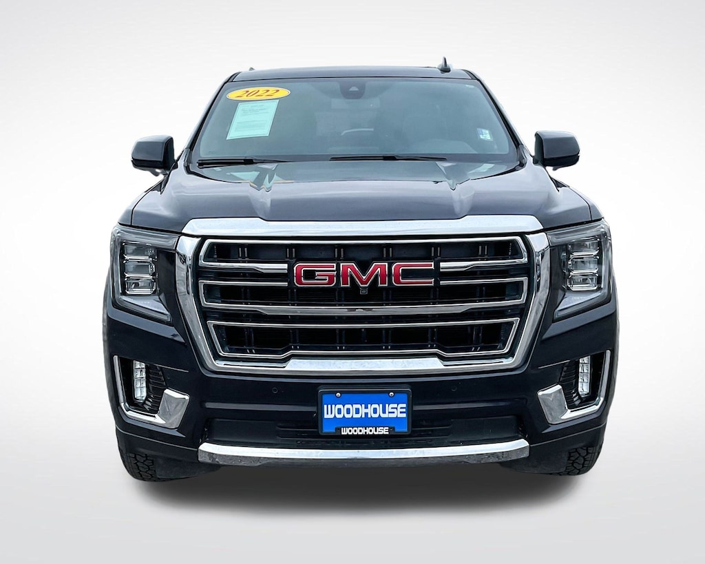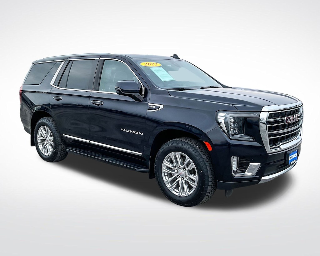 Midnight Blue Metallic 2022 GMC Yukon SLT 4WD 10-Speed Automatic with Overdrive EcoTec3 5.3L V8 4WD, 2 Presets For Outside Rearview Mirrors, 2 Presets For Power Driver Seat, 3.23 Rear Axle Ratio, 3rd Row 60/40 Power-Folding Split-Bench Seat, 3rd row seats: split-bench, 4-Wheel Disc Brakes, 9 Speakers, ABS brakes, Air Conditioning, Alloy wheels, AM/FM radio: SiriusXM with 360L, AM/FM Stereo, Apple CarPlay/Android Auto, Auto High-beam Headlights, Auto-dimming Rear-View mirror, Automatic Emergency Braking, Automatic Stop/Start, Automatic temperature control, Bodyside moldings, Bose 9-Speaker Stereo Audio System Feature, Brake assist, Bright Chrome Bodyside Moldings, Bright Front & Rear Door Sill Plates, Bumpers: body-color, Chrome Door Handles w/Body-Color Strip, Compass, Delay-off headlights, Driver door bin, Driver vanity mirror, Dual front impact airbags, Dual front side impact airbags, Dual-Pane Panoramic Power Sunroof, Electronic Stability Control, Emergency communication system: OnStar and GMC Connected Services capable, Extra Capacity Cooling System, Following Distance Indicator, Forward Collision Alert, Four wheel independent suspension, Front & Rear Park Assist, Front anti-roll bar, Front Bucket Seats, Front Center Armrest, Front dual zone A/C, Front fog lights, Front Pedestrian Braking, Front reading lights, Fully automatic headlights, Garage door transmitter, Hands-Free Power Programmable Rear Liftgate, HD Surround Vision, Heated & Ventilated Driver & Front Passenger Seats, Heated 2nd Row Outboard Position Seats, Heated door mirrors, Heated Driver & Front Passenger Seats, Heated front seats, Heated Steering Wheel, Hitch Guidance w/Hitch View, Illuminated entry, Inside Rear-View Auto-Dimming Mirror, Integrated Trailer Brake Controller, IntelliBeam Automatic High Beam On/Off, Lane Change Alert w/Side Blind Zone Alert, Lane Keep Assist w/Lane Departure Warning, Leather steering wheel, License Plate Front Mounting Package, Low tire pressure warning, Max Trailering Package, Memory seat, Navigation System, Not Equipped w/4-Way Driver & Fr Pass Pwr Lumbar, Not Equipped w/Heated Steering Wheel (DISC), Not Equipped w/Steering Column Lock, Occupant sensing airbag, Outside Heated Power-Adjustable Mirrors, Outside temperature display, Overhead airbag, Overhead console, Panic alarm, Passenger door bin, Passenger vanity mirror, Perforated Leather-Appointed Seating, Power door mirrors, Power driver seat, Power Liftgate, Power passenger seat, Power Release 2nd Row 60/40 Split-Folding Bench Seat, Power Release 2nd Row Bucket Seats, Power steering, Power Tilt & Telescopic Steering Column, Power windows, Preferred Equipment Group 4SA, Premium Smooth Ride Suspension, Rain sensing wipers, Rear air conditioning, Rear anti-roll bar, Rear Cross Traffic Alert, Rear Pedestrian Alert, Rear reading lights, Rear seat center armrest, Rear window defroster, Rear window wiper, Remote keyless entry, Roof rack: rails only, Safety Alert Seat, Security system, SiriusXM w/360L, SLT Luxury Package, Smart Trailer Integration Indicator, Speed control, Speed-sensing steering, Split folding rear seat, Spoiler, Start/Stop System Disable Button, Steering wheel mounted audio controls, Tachometer, Telescoping steering wheel, Tilt steering wheel, Traction control, Trailer Side Blind Zone Alert, Trip computer, Universal Home Remote, Variably intermittent wipers, Ventilated front seats, Voltmeter, Wheels: 20" x 9" 6-Spoke Polished Aluminum, Wireless Charging, 4WD.