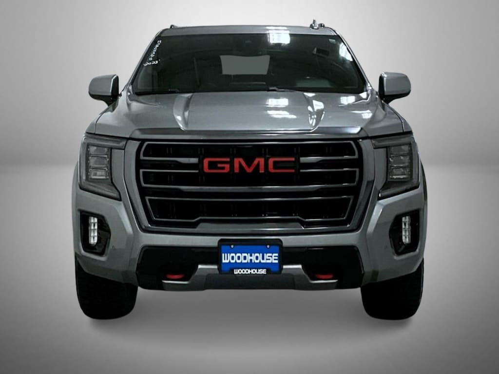 Silver 2023 GMC Yukon AT4 4WD 10-Speed Automatic with Overdrive EcoTec3 5.3L V8 4WD, 2 Presets For Outside Rearview Mirrors, 3 Years of GMC Connected Services, 3 Years of OnStar Safety & Security, 3.23 Rear Axle Ratio, 3rd Row 60/40 Power-Folding Split-Bench Seat, 3rd row seats: split-bench, 4-Wheel Disc Brakes, 9 Speakers, ABS brakes, Adaptive suspension, Air Conditioning, Alloy wheels, AM/FM radio: SiriusXM with 360L, AM/FM Stereo, Apple CarPlay/Android Auto, Auto High-beam Headlights, Auto-dimming door mirrors, Auto-dimming Rear-View mirror, Auto-leveling suspension, Automatic Emergency Braking, Automatic temperature control, Black Roof-Mounted Luggage Rack Side Rails, Bose 9-Speaker Stereo Audio System Feature, Brake assist, Bright Front & Rear Door Sill Plates, Bumpers: body-color, Compass, Delay-off headlights, Driver door bin, Driver vanity mirror, Dual front impact airbags, Dual front side impact airbags, Electronic Stability Control, Emergency communication system: OnStar and GMC connected services capable, Following Distance Indicator, Forward Collision Alert, Four wheel independent suspension, Front & Rear Park Assist, Front anti-roll bar, Front Bucket Seats, Front Center Armrest, Front dual zone A/C, Front fog lights, Front High-Approach Angle Fascia, Front Pedestrian Braking, Front reading lights, Fully automatic headlights, Garage door transmitter, Hands-Free Power Programmable Rear Liftgate, Heated & Ventilated Driver & Front Passenger Seats, Heated 2nd Row Outboard Position Seats, Heated door mirrors, Heated Driver & Front Passenger Seats, Heated front seats, Heated rear seats, Heated Steering Wheel, Heated steering wheel, Heavy-Duty Air Filter, Hill Descent Control, Illuminated entry, Inside Rear-View Auto-Dimming Mirror, IntelliBeam Automatic High Beam On/Off, Lane Change Alert w/Side Blind Zone Alert, Lane Keep Assist w/Lane Departure Warning, Low tire pressure warning, Magnetic Ride Control Suspension, Memory seat, Navigation System, Occupant sensing airbag, Outside Heated Power-Adjustable Mirrors, Outside temperature display, Overhead airbag, Overhead console, Panic alarm, Passenger door bin, Passenger vanity mirror, Perforated Leather Seating Surfaces, Power door mirrors, Power driver seat, Power Liftgate, Power passenger seat, Power Release 2nd Row 60/40 Split-Folding Bench Seat, Power steering, Power Tilt & Telescopic Steering Column, Power windows, Rain sensing wipers, Rear air conditioning, Rear anti-roll bar, Rear Cross Traffic Alert, Rear reading lights, Rear seat center armrest, Rear window defroster, Rear window wiper, Red Horizontal-Mounted Recovery Hooks, Remote keyless entry, Roof rack: rails only, Safety Alert Seat, Security system, SiriusXM w/360L, Speed control, Speed-sensing steering, Split folding rear seat, Spoiler, Steering wheel memory, Steering wheel mounted audio controls, Tachometer, Telescoping steering wheel, Tilt steering wheel, Traction control, Trip computer, Turn signal indicator mirrors, Universal Home Remote, Variably intermittent wipers, Ventilated front seats, Voltmeter, Wheels: 20" x 9" 6-Spoke Machined Aluminum, Wireless Charging, 4WD.