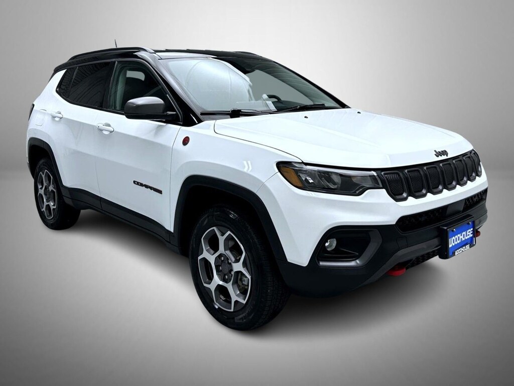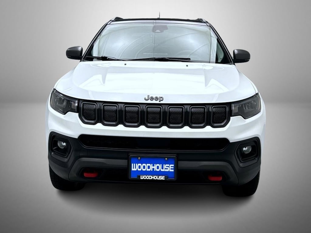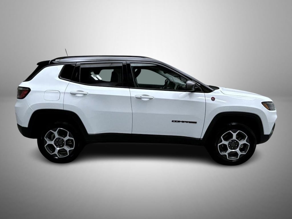 Bright White Clearcoat 2022 Jeep Compass Trailhawk 4WD 9-Speed 948TE Automatic 2.4L I4 4WD, 10.1" Touchscreen Display, 4-Wheel Disc Brakes, 4.334 Axle Ratio, 6 Speakers, ABS brakes, Air Conditioning, Alloy wheels, AM/FM radio: SiriusXM, Anti-whiplash front head restraints, Auto High-beam Headlights, Auto-dimming Rear-View mirror, Automatic temperature control, Brake assist, Bumpers: body-color, Compass, Delay-off headlights, Disassociated Touchscreen Display, Driver door bin, Driver vanity mirror, Dual front impact airbags, Dual front side impact airbags, Electronic Stability Control, Emergency communication system: SiriusXM Guardian, Four wheel independent suspension, Front anti-roll bar, Front Bucket Seats, Front Center Armrest w/Storage, Front dual zone A/C, Front fog lights, Front License Plate Bracket, Front reading lights, Fully automatic headlights, Global Telematics Box Module (TBM), Heated door mirrors, Illuminated entry, Knee airbag, Leather Shift Knob, Low tire pressure warning, Occupant sensing airbag, Outside temperature display, Overhead airbag, Overhead console, Panic alarm, ParkView Rear Back-Up Camera, Passenger door bin, Passenger vanity mirror, Power door mirrors, Power steering, Power windows, Premium Cloth/Leather Trim Bucket Seats, Quick Order Package 2GE, Radio: Uconnect 5 w/10.1" Display, Rain sensing wipers, Rear anti-roll bar, Rear seat center armrest, Rear window defroster, Rear window wiper, Remote keyless entry, Roof rack: rails only, Security system, Speed control, Split folding rear seat, Spoiler, Steering wheel mounted audio controls, Tachometer, Telescoping steering wheel, Tilt steering wheel, Traction control, Trip computer, Turn signal indicator mirrors, Variably intermittent wipers, Wheels: 17" x 6.5" Painted Diamond Cut Aluminum, 4WD.