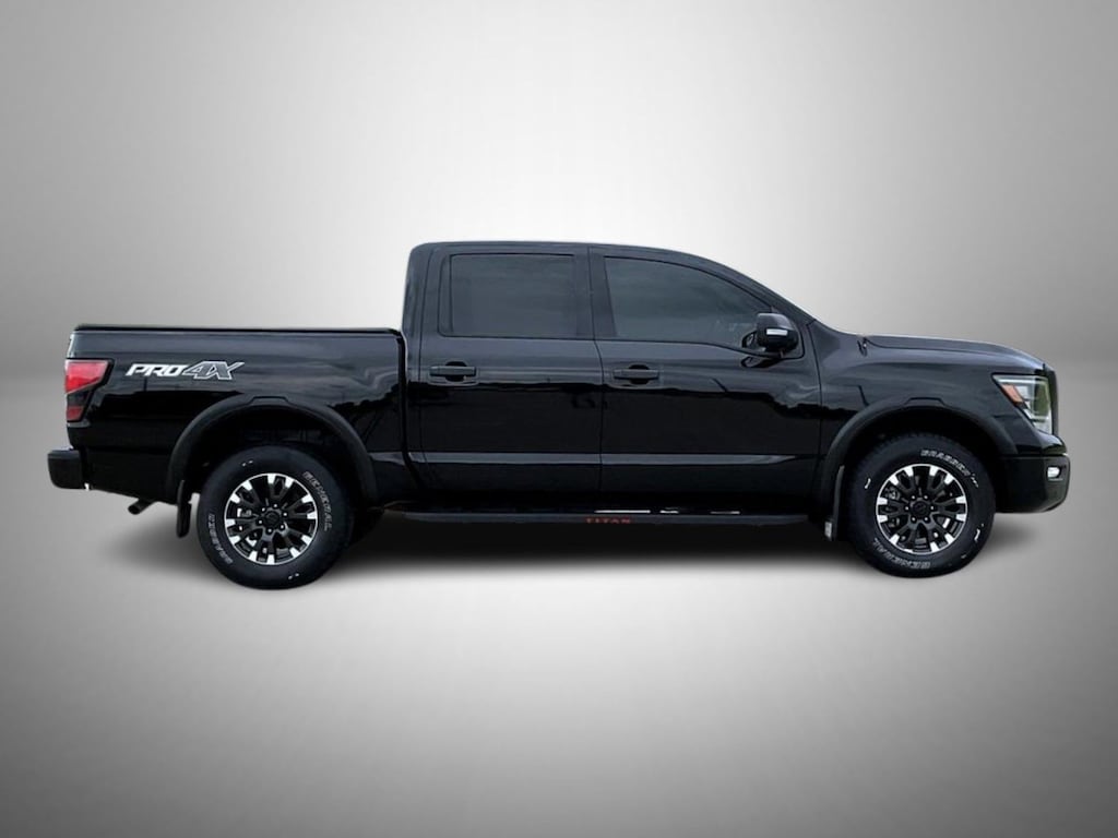 Super Black 2020 Nissan Titan PRO-4X 4WD 9-Speed Automatic 5.6L V8 DOHC 32V LEV3-ULEV70 400hp 4WD, 3.692 Axle Ratio, 4-Way Power Assist Seat, 4-Wheel Disc Brakes, 6 Speakers, ABS brakes, Air Conditioning, Alloy wheels, AM/FM radio: SiriusXM, Auto High-beam Headlights, Auto-dimming Rear-View mirror, Auto-leveling suspension, Automatic temperature control, Blind Spot Warning, Brake assist, Cloth Seat Trim w/Vinyl Bolsters, Compass, Delay-off headlights, Driver door bin, Driver vanity mirror, Dual front impact airbags, Dual front side impact airbags, Electronic Stability Control, Emergency communication system: NissanConnect Services, Fender Premium Audio System w/12 Speakers, Front anti-roll bar, Front Bucket Seats, Front Captain's Seats, Front Center Armrest, Front dual zone A/C, Front fog lights, Front reading lights, Front wheel independent suspension, Fully automatic headlights, Garage door transmitter: HomeLink, Heated door mirrors, Heated Driver & Passenger Seat, Heated Power Tilt/Telescopic Steering Wheel, Heated Rear Seats, Illuminated entry, Intelligent Around View Monitor (I-AVM), Knee airbag, Leather Seat Trim, Leather steering wheel, Low tire pressure warning, Memory Driver Seat w/Auto Entry/Exit Feature, Navigation system: NissanConnect Navigation, NissanConnect featuring Apple CarPlay and Android Auto, Occupant sensing airbag, Outside temperature display, Overhead airbag, Overhead console, Panic alarm, Passenger door bin, Passenger vanity mirror, Power door mirrors, Power driver seat, Power Folding Auto Dimming Outside Mirrors, Power steering, Power windows, PRO-4X Badged Floor Mats, PRO-4X Convenience Package, PRO-4X Illuminated Kick Plate, PRO-4X Utility Package, Pro4X Mud Flaps, Protection Package 2, Proximity Activation, Radio data system, Radio: NissanConnect w/Navigation, Rain sensing wipers, Rear anti-roll bar, Rear Bumper Step w/Electronic Tailgate Lock, Rear Parking Sensors, Rear seat center armrest, Rear step bumper, Rear Under Seat Storage, Rear window defroster, Remote keyless entry, Rugged Step Boards w/PRO-X4 Insert, Security system, Speed control, Speed-sensing steering, Speed-Sensitive Wipers, Split folding rear seat, Steering wheel mounted audio controls, Tachometer, Telescoping steering wheel, Tilt steering wheel, Traction control, Trip computer, Turn signal indicator mirrors, Variably intermittent wipers, Voltmeter, Wheels: 18" x 8" Painted Dark Finish Alloy, 4WD.