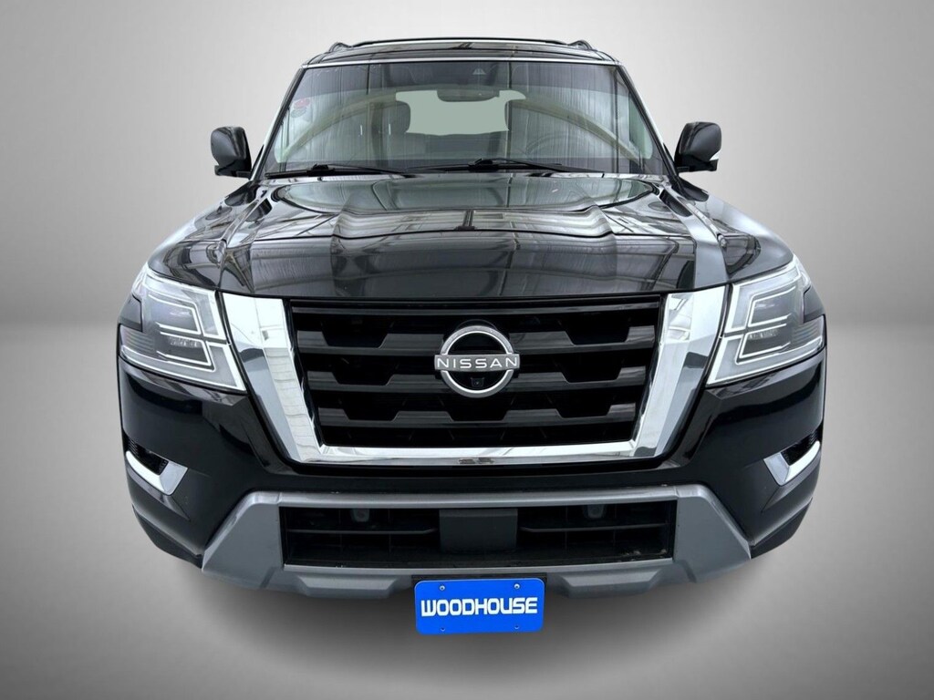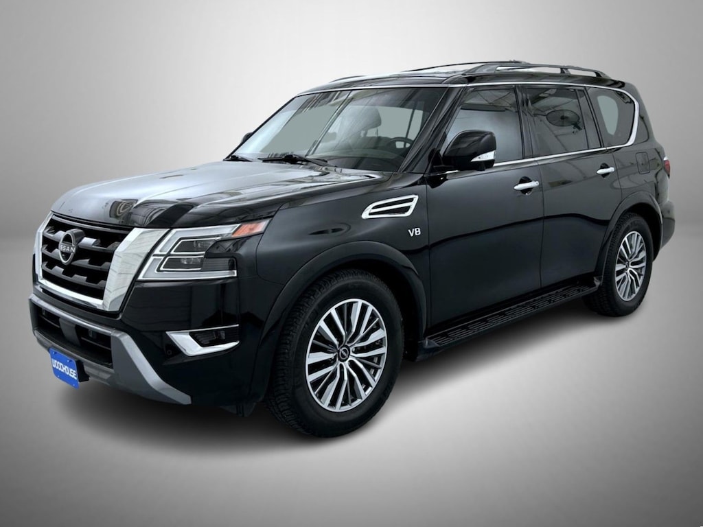 Super Black 2021 Nissan Armada SL 4WD 7-Speed Automatic 5.6L V8 DOHC 32V LEV3-ULEV125 400hp 4WD, 13 Speakers, 2.94 Axle Ratio, 20" Painted Alloy Wheels, 2nd Row Captain's Chairs, 2nd Row Center Console w/Padded Armrest, 3rd Row Carpeted Floor Mats - Captain Seat, 3rd row seats: split-bench, 4-Wheel Disc Brakes, ABS brakes, Air Conditioning, Alloy wheels, AM/FM radio: SiriusXM, Anti-whiplash front head restraints, Auto High-beam Headlights, Auto tilt-away steering wheel, Auto-dimming door mirrors, Auto-dimming Rear-View mirror, Auto-leveling suspension, Automatic temperature control, Brake assist, Bumpers: body-color, Captain's Chairs Package, Cross Bars, Delay-off headlights, Driver door bin, Driver vanity mirror, Dual front impact airbags, Dual front side impact airbags, Electronic Stability Control, Emergency communication system: NissanConnect Services, Exterior Parking Camera Rear, Four wheel independent suspension, Front anti-roll bar, Front Bucket Seats, Front Center Armrest, Front dual zone A/C, Front fog lights, Front reading lights, Fully automatic headlights, Garage door transmitter: HomeLink, Heated door mirrors, Heated Front Bucket Seats, Heated front seats, Illuminated entry, Illuminated Kick Plates, Leather Seat Trim, Leather Shift Knob, Low tire pressure warning, Memory seat, Navigation System, NissanConnect featuring Apple CarPlay and Android Auto, Occupant sensing airbag, Outside temperature display, Overhead airbag, Overhead console, Panic alarm, Passenger door bin, Passenger vanity mirror, Power door mirrors, Power driver seat, Power Liftgate, Power moonroof, Power passenger seat, Power steering, Power windows, Radio: NissanConnect w/SiriusXM, Rear air conditioning, Rear anti-roll bar, Rear reading lights, Rear seat center armrest, Rear window defroster, Rear window wiper, Reclining 3rd row seat, Remote keyless entry, Security system, Speed control, Speed-sensing steering, Speed-Sensitive Wipers, Split folding rear seat, Spoiler, Steering wheel memory, Steering wheel mounted audio controls, Tachometer, Telescoping steering wheel, Tilt steering wheel, Traction control, Trip computer, Turn signal indicator mirrors, Variably intermittent wipers, Voltmeter, 4WD.