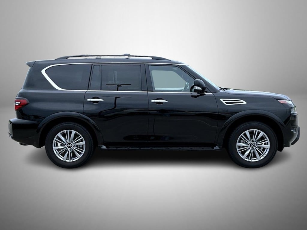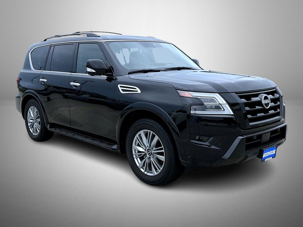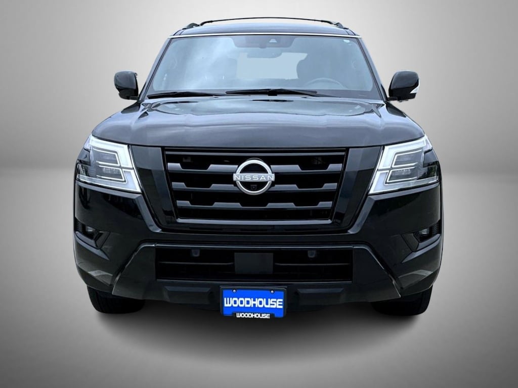 Super Black 2022 Nissan Armada SL 4WD 7-Speed Automatic 5.6L V8 DOHC 32V LEV3-ULEV125 400hp 4WD, 13 Speakers, 2.94 Axle Ratio, 20" x 8J Aluminum Alloy Wheels, 2nd Row Captain's Chairs, 2nd Row Center Console w/Padded Armrest, 3rd row seats: split-bench, 4-Wheel Disc Brakes, ABS brakes, Air Conditioning, Alloy wheels, AM/FM radio: SiriusXM, Anti-whiplash front head restraints, Auto High-beam Headlights, Auto tilt-away steering wheel, Auto-dimming door mirrors, Auto-Dimming Exterior Mirror w/LED Turn Signals, Auto-dimming Rear-View mirror, Auto-leveling suspension, Automatic temperature control, Black Painted Grille, Black Painted Roof Rails, Brake assist, Bumpers: body-color, Captain's Chairs Package, Cargo Mat & Midnight Edition Floor Mats, Delay-off headlights, Driver door bin, Driver vanity mirror, Dual front impact airbags, Dual front side impact airbags, Electronic Stability Control, Emergency communication system: NissanConnect Services, Exterior Parking Camera Rear, Four wheel independent suspension, Front & Rear Lower Center Bumper Fascias, Front anti-roll bar, Front Bucket Seats, Front Center Armrest, Front dual zone A/C, Front fog lights, Front reading lights, Fully automatic headlights, Garage door transmitter: HomeLink, Heated door mirrors, Heated Front Bucket Seats, Heated front seats, Illuminated entry, Illuminated Kick Plates, Knee airbag, Leather Appointed Seat Trim, Leather Shift Knob, Leather-Appointed Seat Trim, Low tire pressure warning, Memory seat, Midnight Edition Package, Navigation System, NissanConnect featuring Apple CarPlay and Android Auto, Occupant sensing airbag, Outside temperature display, Overhead airbag, Overhead console, Panic alarm, Passenger door bin, Passenger vanity mirror, Power door mirrors, Power driver seat, Power Liftgate, Power moonroof, Power passenger seat, Power steering, Power windows, Radio: NissanConnect w/SiriusXM, Rear air conditioning, Rear anti-roll bar, Rear LED Lamps w/Black Paint Finisher, Rear reading lights, Rear seat center armrest, Rear window defroster, Rear window wiper, Reclining 3rd row seat, Remote keyless entry, Security system, Speed control, Speed-sensing steering, Speed-Sensitive Wipers, Split folding rear seat, Spoiler, Steering wheel memory, Steering wheel mounted audio controls, Tachometer, Telescoping steering wheel, Tilt steering wheel, Traction control, Trip computer, Turn signal indicator mirrors, Variably intermittent wipers, Voltmeter, Wheels: 20" x 8J Painted Alloy, 4WD.