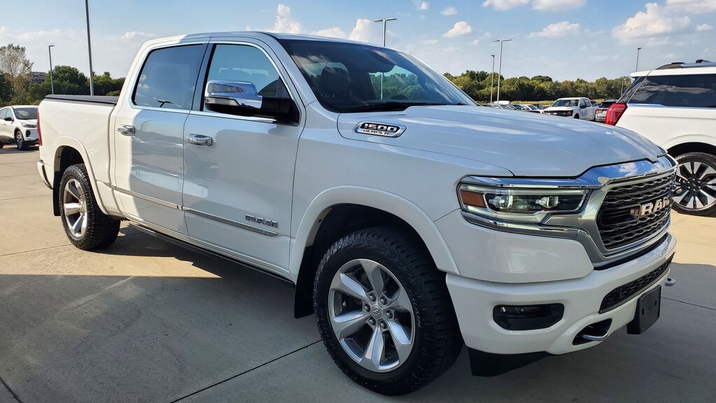 Ivory White Tri-Coat Pearlcoat 2019 Ram 1500 Limited 4WD 8-Speed Automatic HEMI 5.7L V8 Multi Displacement VVT 1-Yr SiriusXM Guardian Trial, 10 Speakers, 12" Touchscreen Display, 3.21 Rear Axle Ratio, 4-Wheel Disc Brakes, 48V Belt Starter Generator, ABS brakes, Adjustable pedals, Air Conditioning, Alloy wheels, AM/FM radio: SiriusXM with 360L, Anti-Spin Differential Rear Axle, Apple CarPlay, Apple CarPlay/Android Auto, Audio memory, Auto High-beam Headlights, Auto-dimming door mirrors, Auto-dimming Rear-View mirror, Auto-leveling suspension, Automatic temperature control, Body Color Bumper Group, Bodyside moldings, Brake assist, Bumpers: chrome, Compass, Delay-off headlights, Disassociated Touchscreen Display, Driver door bin, Driver vanity mirror, Dual front impact airbags, Dual front side impact airbags, Electronic Stability Control, Emergency communication system: SiriusXM Guardian, Front anti-roll bar, Front Bucket Seats, Front Center Armrest w/Storage, Front dual zone A/C, Front fog lights, Front reading lights, Front wheel independent suspension, Fully automatic headlights, Garage door transmitter, Genuine wood console insert, Genuine wood dashboard insert, Genuine wood door panel insert, Google Android Auto, GPS Antenna Input, GPS Navigation, HD Radio, Heated door mirrors, Heated front seats, Heated rear seats, Heated steering wheel, Illuminated entry, Integrated Center Stack Radio, Leather steering wheel, Low tire pressure warning, Memory seat, Navigation System, Occupant sensing airbag, Outside temperature display, Overhead airbag, Overhead console, Panic alarm, ParkView Rear Back-Up Camera, Passenger door bin, Passenger vanity mirror, Pedal memory, Power door mirrors, Power driver seat, Power passenger seat, Power steering, Power windows, Premium Leather Trimmed Bucket Seats, Quick Order Package 25M Limited, Radio data system, Radio: Uconnect 12 w/Navigation, Rain sensing wipers, Rear anti-roll bar, Rear seat center armrest, Rear step bumper, Rear window defroster, Remote CD player, Remote keyless entry, Security system, SiriusXM Satellite Radio, SiriusXM Traffic Plus, SiriusXM Travel Link, SiriusXM w/360L, Speed control, Split folding rear seat, Steering wheel mounted audio controls, Tachometer, Telescoping steering wheel, Tilt steering wheel, Traction control, Trailer Brake Control, Trip computer, Turn signal indicator mirrors, USB Host Flip, Variably intermittent wipers, Ventilated front seats, Voltmeter, Wheels: 20" x 9" Polished w/Inserts.