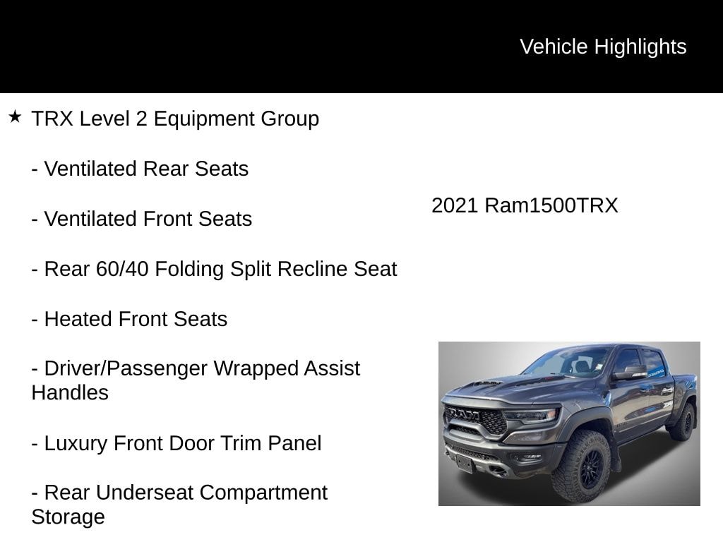 Granite Crystal Metallic Clearcoat 2021 Ram 1500 TRX 4WD 8-Speed Automatic 6.2L Supercharged HEMI V8 SRT 4 Way Front Headrests, Adaptive Cruise Control w/Stop & Go, Advanced Safety Group, Blind Spot & Cross Path Detection, Body Color Door Handles, Bucket Seats, Driver Seat Memory, Driver/Passenger Wrapped Assist Handles, Exterior Mirrors w/Memory, Front Door Accent Lighting, Full Length Premium Upgraded Floor Console, Heads-Up Display, Heated Front Seats, Heated Second Row Seats, Heated Steering Wheel, IP LED Ambient Light Pipe, Lane Keep Assist, Leather Trimmed Bucket Seats, Leather/Carbon Flat-Bottom Steering Wheel, Leather/Suede Flat-Bottom Steering Wheel, LED CHMSL Lamp, Luxury Front Door Trim Panel, Navigation System, ParkSense Front/Rear Park Assist w/Stop, Pedestrian Emergency Braking, Pick-Up Box Lighting, Power 4-Way Driver Lumbar Adjust, Power 4-Way Passenger Lumbar Adjust, Power 8-Way Driver & Passenger Seats, Power Adjustable Pedals w/Memory, Premium Wrapped IP Bezel, Radio/Driver Seat/Mirrors/Pedals Memory, Rain Sensitive Windshield Wipers, Real Carbon Fiber Interior Accents, Rear 60/40 Folding Split Recline Seat, Rear Door Accent Lighting, Rear Underseat Compartment Storage, Rear Window Defroster, Rearview Autodim Digital Display Mirror, Remote Proximity Keyless Entry, Remote Start System, Remote Tailgate Release, Sun Visors w/Illuminated Vanity Mirrors, Surround View Camera System, Technology Group, Trailer Brake Control, TRX Carbon Fiber Package, TRX Level 2 Equipment Group, Universal Garage Door Opener, Ventilated Front Seats, Ventilated Rear Seats, Wireless Charging Pad, 10 Speakers, 3.55 Rear Axle Ratio, 4-Wheel Disc Brakes, ABS brakes, Adaptive suspension, Air Conditioning, Alloy wheels, AM/FM radio: SiriusXM with 360L, Apple CarPlay/Android Auto, Auto High-beam Headlights, Auto-dimming door mirrors, Auto-dimming Rear-View mirror, Automatic temperature control, Bed Utility Group, Black Exterior Mirrors, Brake assist, Cloth/Vinyl Bucket Seats, Compass, Delay-off headlights, Dome Dual LED Reading Lamp, Driver door bin, Dual front impact airbags, Dual front side impact airbags, Dual-Pane Panoramic Sunroof, Electronic Stability Control, Emergency communication system: SiriusXM Guardian, Exterior Mirrors Courtesy Lamps, Exterior Mirrors w/Heating Element, Exterior Mirrors w/Supplemental Signals, Front anti-roll bar, Front Bucket Seats, Front Center Armrest w/Storage, Front dual zone A/C, Front fog lights, Front License Plate Bracket, Front reading lights, Front wheel independent suspension, Fully automatic headlights, harman/kardon 19 Speaker Premium Sound, Heated door mirrors, Illuminated entry, Leather Shift Knob, Leather steering wheel, Low tire pressure warning, MOPAR 4 Adjustable Cargo Tie-Down Hooks, MOPAR Deployable Bed Step, MOPAR Spray In Bedliner, MOPAR TRX Exterior Graphics, MOPAR TRX Hood Graphics, Occupant sensing airbag, Outside temperature display, Overhead airbag, Overhead console, Panic alarm, ParkView Rear Back-Up Camera, Passenger door bin, Passenger vanity mirror, Power door mirrors, Power driver seat, Power steering, Power windows, Power-Folding Mirrors, Quick Order Package 29Y, Radio data system, Radio: Uconnect 12 w/Navigation, Rear seat center armrest, Rear step bumper, Remote keyless entry, Security system, Speed control, Split folding rear seat, Sport steering wheel, Steering wheel mounted audio controls, Tachometer, Telescoping steering wheel, Tilt steering wheel, Traction control, Trailer Light Check, Trailer Reverse Steering Control, Trailer Tire Pressure Monitoring System, Trailer Tow Group, Trip computer, Turn signal indicator mirrors, Variably intermittent wipers, Voltmeter, Wheels: 18" x 9" Bead-Lock Aluminum (DISC), Wheels: 18" x 9" Black Paint/Polish Aluminum, 4 Way Front Headrests, Adaptive Cruise Control w/Stop & Go, Advanced Safety Group, Blind Spot & Cross Path Detection, Body Color Door Handles, Bucket Seats, Driver Seat Memory, Driver/Passenger Wrapped Assist Handles, Ext
