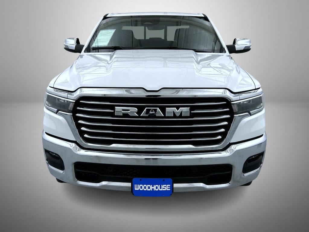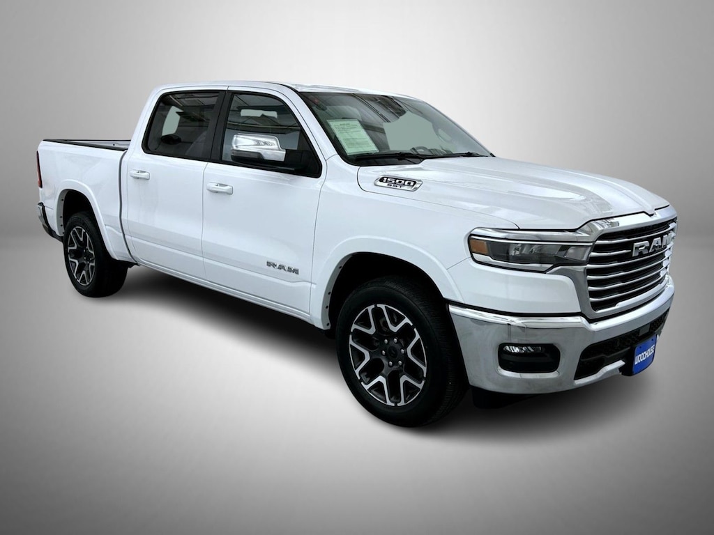 Bright White Clearcoat 2025 Ram 1500 Laramie 4WD 8-Speed Automatic 3.0L I6 10 Speakers, 3 Rear Seat Head Restraints, 3.55 Rear Axle Ratio, 3.92 Rear Axle Ratio, 4 Way Front Headrests, 4-Wheel Disc Brakes, 4G LTE Wi-Fi Hot Spot, ABS brakes, Air Conditioning, Alloy wheels, AM/FM radio: SiriusXM with 360L, Anti-Spin Differential Rear Axle, Apple CarPlay, Apple CarPlay/Android Auto, Audio memory, Auto High-beam Headlights, Auto Power-Folding Mirrors, Auto-dimming door mirrors, Auto-Dimming Exterior Driver Mirror, Auto-dimming Rear-View mirror, Automatic temperature control, Brake assist, Bumpers: chrome, Chrome Exterior Mirrors, Compass, Connected Travel & Traffic Services, Connectivity - US/Canada, Convex Wide-Angle Exterior Mirror Insert, Delay-off headlights, Driver door bin, Driver Seat Memory, Driver vanity mirror, Dual front impact airbags, Dual front side impact airbags, Electronic Stability Control, Exterior Mirrors Courtesy Lamps, Exterior Mirrors w/Heating Element, Exterior Mirrors w/Memory, Exterior Mirrors w/Supplemental Signals, Front anti-roll bar, Front Center Armrest w/Storage, Front dual zone A/C, Front fog lights, Front License Plate Bracket, Front reading lights, Front Seat Back Map Pockets, Front wheel independent suspension, Fully automatic headlights, Garage door transmitter, Google Android Auto, GPS Antenna Input, GPS Navigation, HD Radio, Heated door mirrors, Heated Front Seats, Heated front seats, Heated rear seats, Heated Steering Wheel, Heated steering wheel, Illuminated entry, Integrated Voice Command w/Bluetooth, Laramie Level 1 Equipment Group, Leather steering wheel, Leather Trim 40/20/40 Bench Seat, Low tire pressure warning, Memory seat, Navigation System, Occupant sensing airbag, Outside temperature display, Overhead airbag, Overhead console, Panic alarm, ParkView Rear Back-Up Camera, Passenger door bin, Passenger vanity mirror, Power 2-Way Driver Lumbar Adjust, Power 2-Way Passenger Lumbar Adjust, Power Adjust 8-Way Front Passenger Seat, Power door mirrors, Power driver seat, Power passenger seat, Power steering, Power windows, Quick Order Package 21H Laramie, Radio data system, Radio: Uconnect 5 Nav w/12.0" Display, Rain Sensitive Windshield Wipers, RAM Grille Badge - Chrome, Rear anti-roll bar, Rear reading lights, Rear seat center armrest, Rear step bumper, Remote keyless entry, Remote Tailgate Release, Security system, SiriusXM w/360L, Speed control, Split folding rear seat, Steering wheel mounted audio controls, Tachometer, Telescoping steering wheel, Tilt steering wheel, Traction control, Trip computer, Turn signal indicator mirrors, USB Host Flip, Variably intermittent wipers, Ventilated Front Seats, Ventilated front seats, Voltmeter, Wheels: 20" x 9" Premium Paint/Polish.