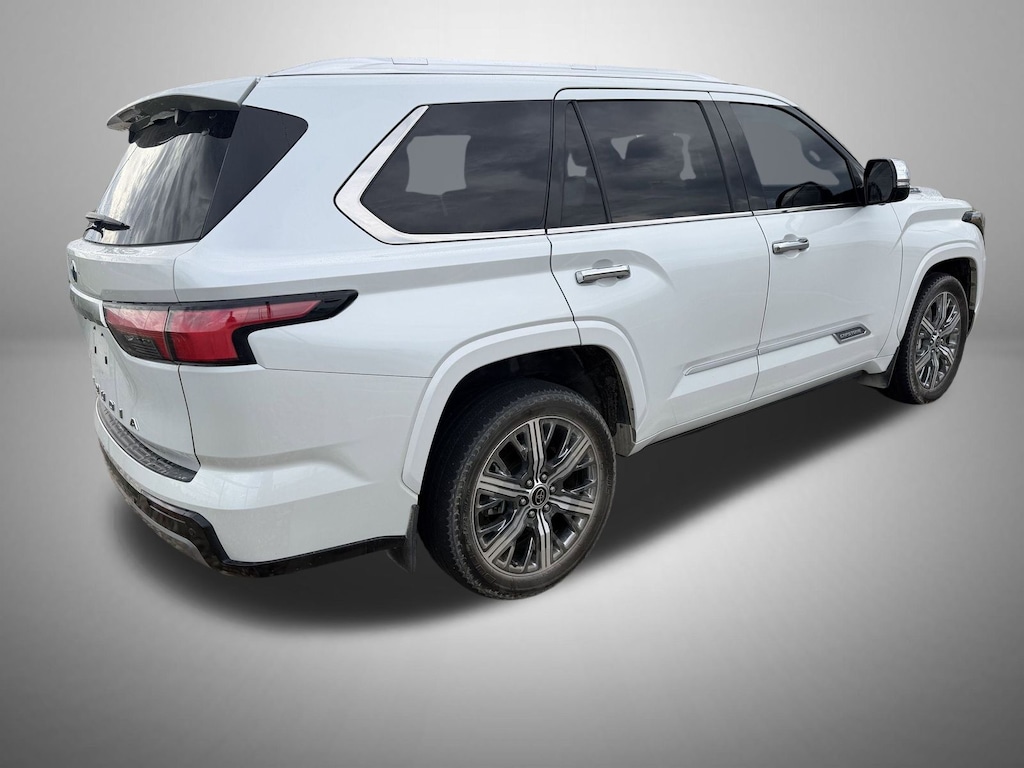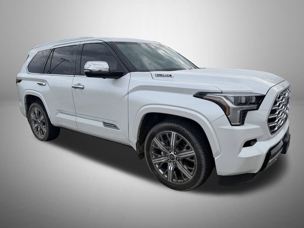 White 2023 Toyota Sequoia Capstone 4WD 10-Speed Automatic V6 Hybrid V6 Hybrid, 10-Speed Automatic, 4WD, 14 Speakers, 3.31 Axle Ratio, 3rd row seats: split-bench, 4-Wheel Disc Brakes, ABS brakes, Air Conditioning, Alloy wheels, AM/FM radio: SiriusXM, Anti-whiplash front head restraints, Apple CarPlay/Android Auto, Auto High-beam Headlights, Auto tilt-away steering wheel, Auto-dimming door mirrors, Auto-dimming Rear-View mirror, Automatic Power Extending Running Boards, Automatic temperature control, Brake assist, Bumpers: body-color, Compass, Delay-off headlights, Driver door bin, Driver vanity mirror, Dual front impact airbags, Dual front side impact airbags, Electronic Stability Control, Emergency communication system: Safety Connect (10-year trial), Front anti-roll bar, Front Bucket Seats, Front Center Armrest w/Storage, Front dual zone A/C, Front fog lights, Front reading lights, Front wheel independent suspension, Fully automatic headlights, Garage door transmitter: HomeLink, Genuine wood door panel insert, Head Up Display (HUD), Headlight cleaning, Heads-Up Display, Heated & Ventilated Front Seats, Heated door mirrors, Heated front seats, Heated Power Auto-Dimming Outside Mirrors, Heated rear seats, Heated steering wheel, Illuminated entry, Knee airbag, Leather Shift Knob, Leather steering wheel, Low tire pressure warning, Memory seat, Navigation system: Drive Connect (1 year trial) includes Cloud Navigation with real time traffic and Google POI, Occupant sensing airbag, Outside temperature display, Overhead airbag, Overhead console, Panic alarm, Passenger door bin, Passenger vanity mirror, Power door mirrors, Power driver seat, Power Liftgate, Power moonroof, Power passenger seat, Power steering, Power windows, Premium audio system: JBL, Radio: JBL Premium Audio System, Rain sensing wipers, Rear air conditioning, Rear reading lights, Rear seat center armrest, Rear window defroster, Rear window wiper, Reclining 3rd row seat, Remote keyless entry, Security system, Semi-Aniline Leather Seat Trim, Speed control, Speed-sensing steering, Split folding rear seat, Spoiler, Sport steering wheel, Steering wheel mounted audio controls, Tachometer, Telescoping steering wheel, Tilt steering wheel, Traction control, Trip computer, Turn signal indicator mirrors, Variably intermittent wipers, Ventilated front seats, Ventilated rear seats, Voltmeter, Wheels: 22" Machined-Finish Alloy, V6 Hybrid, 10-Speed Automatic, 4WD.